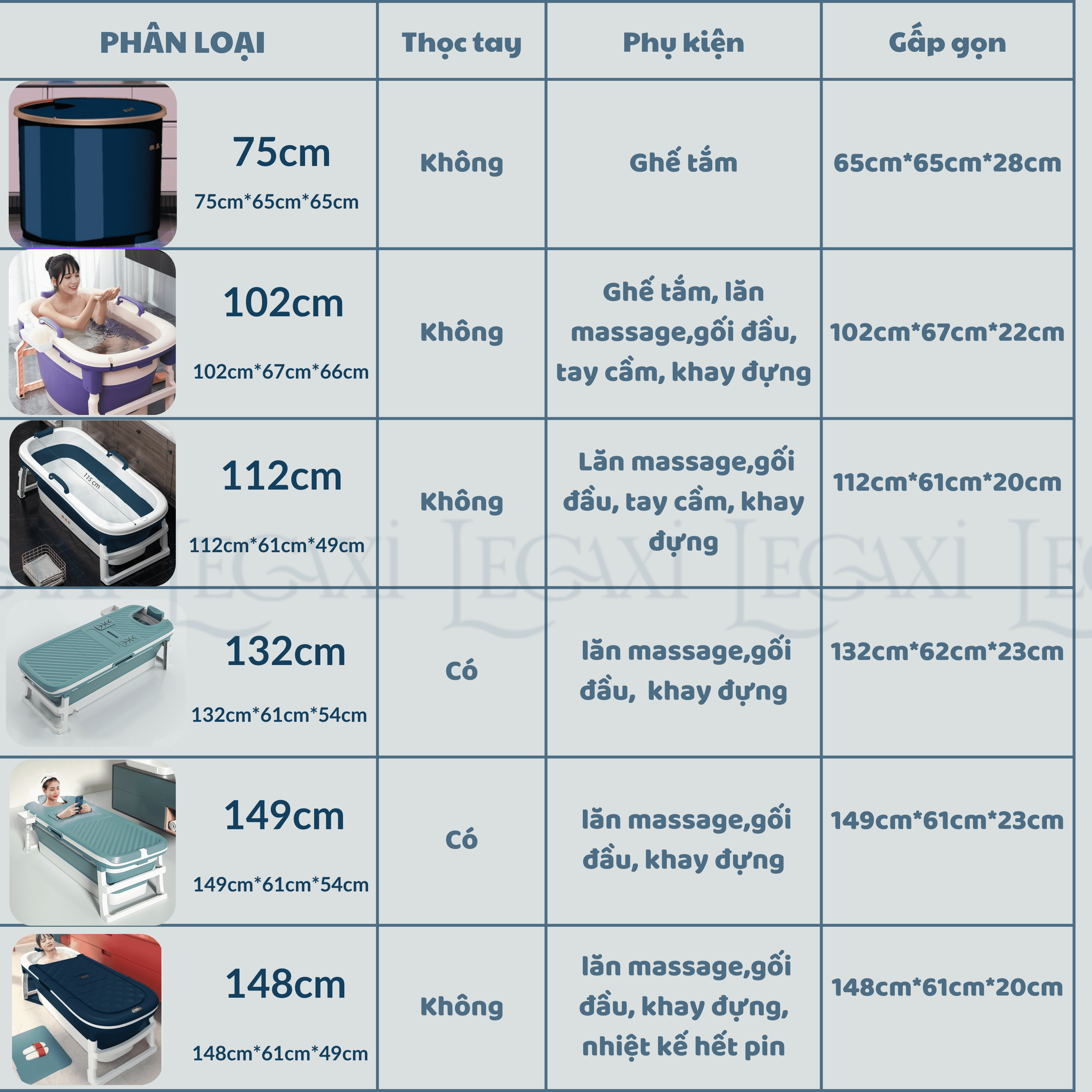 Size 148 cm: Kích thước đầy đủ 1486149 cm – gấp gọn 1486120cm, có nhiệt kế khách lắp pin khi có nhu cầu sử dụng