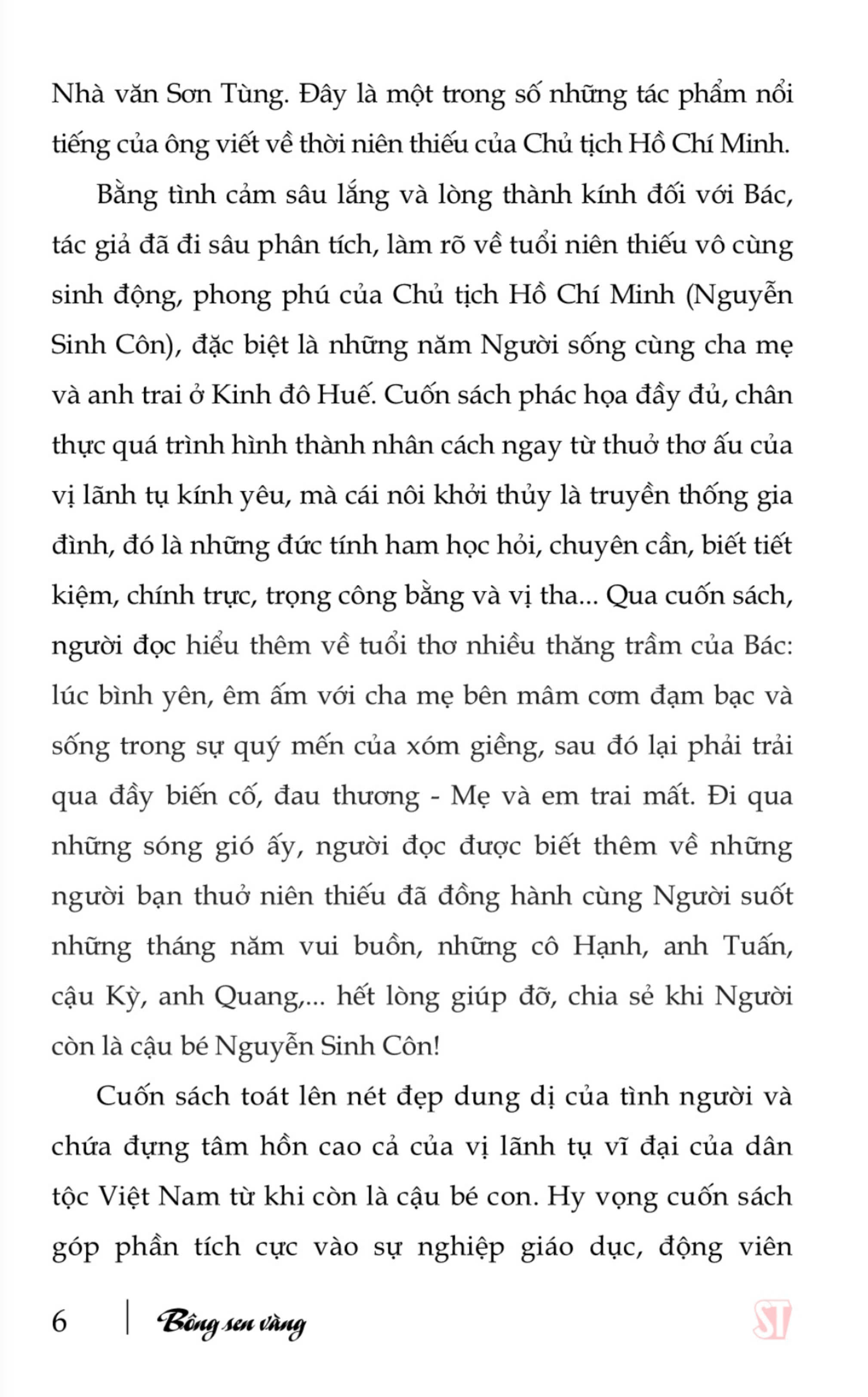 Hồ Chí Minh là một trong số rất ít nhân vật trong lịch sử đã trở thành một huyền thoại ngay từ khi còn sống. Người là hiện thân đầy đủ nhất, cao đẹp nhất của tấm gương đạo đức cách mạng; là hiện thân của sự kết tinh những truyền thống tốt đẹp của dân tộc gắn liền với phẩm chất cao quý của người cộng sản trong thời đại mới. Cuộc đời của Chủ tịch Hồ Chí Minh; phong cách sống, lao động, làm việc, học tập; tâm hồn, trí tuệ, nghị lực của Người tiêu biểu cho tinh hoa, khí phách dân tộc Việt Nam. Chủ tịch Hồ Chí Minh, cuộc đời và sự nghiệp của Người, tư tưởng và nhân cách của Người mãi mãi là nguồn cảm hứng bất tận của các nhà nghiên cứu, nhà văn, nhà thơ, nhà báo… Trong số đó, Sơn Tùng là nhà văn đã để lại dấu ấn sâu sắc trong mảng đề tài sáng tác về Chủ tịch Hồ Chí Minh. Nhân dịp kỷ niệm 35 năm (1987 - 2022) UNESCO vinh danh Chủ tịch Hồ Chí Minh là Anh hùng giải phóng dân tộc, Nhà văn hóa kiệt xuất, Nhà xuất bản Chính trị quốc gia Sự thật xuất bản ấn phẩm BÔNG SEN VÀNG của Nhà văn Sơn Tùng. Đây là một trong số những tác phẩm nổi tiếng của ông viết về thời niên thiếu của Chủ tịch Hồ Chí Minh. Bằng tình cảm sâu lắng và lòng thành kính đối với Bác, tác giả đã đi sâu phân tích, làm rõ về tuổi niên thiếu vô cùng sinh động, phong phú của Chủ tịch Hồ Chí Minh, đặc biệt là những năm Người sống cùng cha mẹ và anh trai ở Kinh đô Huế. Cuốn sách phác họa đầy đủ, chân thực quá trình hình thành nhân cách ngay từ thủa thơ ấu của vị lãnh tụ kính yêu, mà cái nôi khởi thủy là truyền thống gia đình, đó là những đức tính ham học hỏi, chuyên cần, biết tiết kiệm, chính trực, trọng công bằng và vị tha… Qua cuốn sách người đọc hiểu thêm về tuổi thơ lắm thăng trầm của Bác: lúc bình yên, êm ấm với cha mẹ bên mâm cơm đạm bạc và sống trong sự quý mến của xóm giềng, sau đó lại phải trải đầy biến cố, đau thương - Mẹ và em trai mất. Đi qua những sóng gió ấy, người đọc được biết thêm về những người bạn thuở niên thiếu đã đồng hành cùng Người suốt những tháng năm vui buồn, những cô Hạnh, anh Tuấn, cậu Kỳ, anh Quang,… hết lòng giúp đỡ, chia sẻ khi Người còn là cậu bé Nguyễn Sinh Côn! Cuốn sách toát lên nét đẹp dung dị của tình người và chứa đựng tâm hồn cao cả của vị lãnh tụ vĩ đại của dân tộc Việt Nam từ khi còn là cậu bé con. Hy vọng cuốn sách góp phần tích cực vào sự nghiệp giáo dục, động viên thế hệ trẻ Việt Nam nâng cao ý thức, tinh thần trách nhiệm với vận mệnh Tổ quốc, rèn luyện bản thân thành người có phẩm cách lớn.