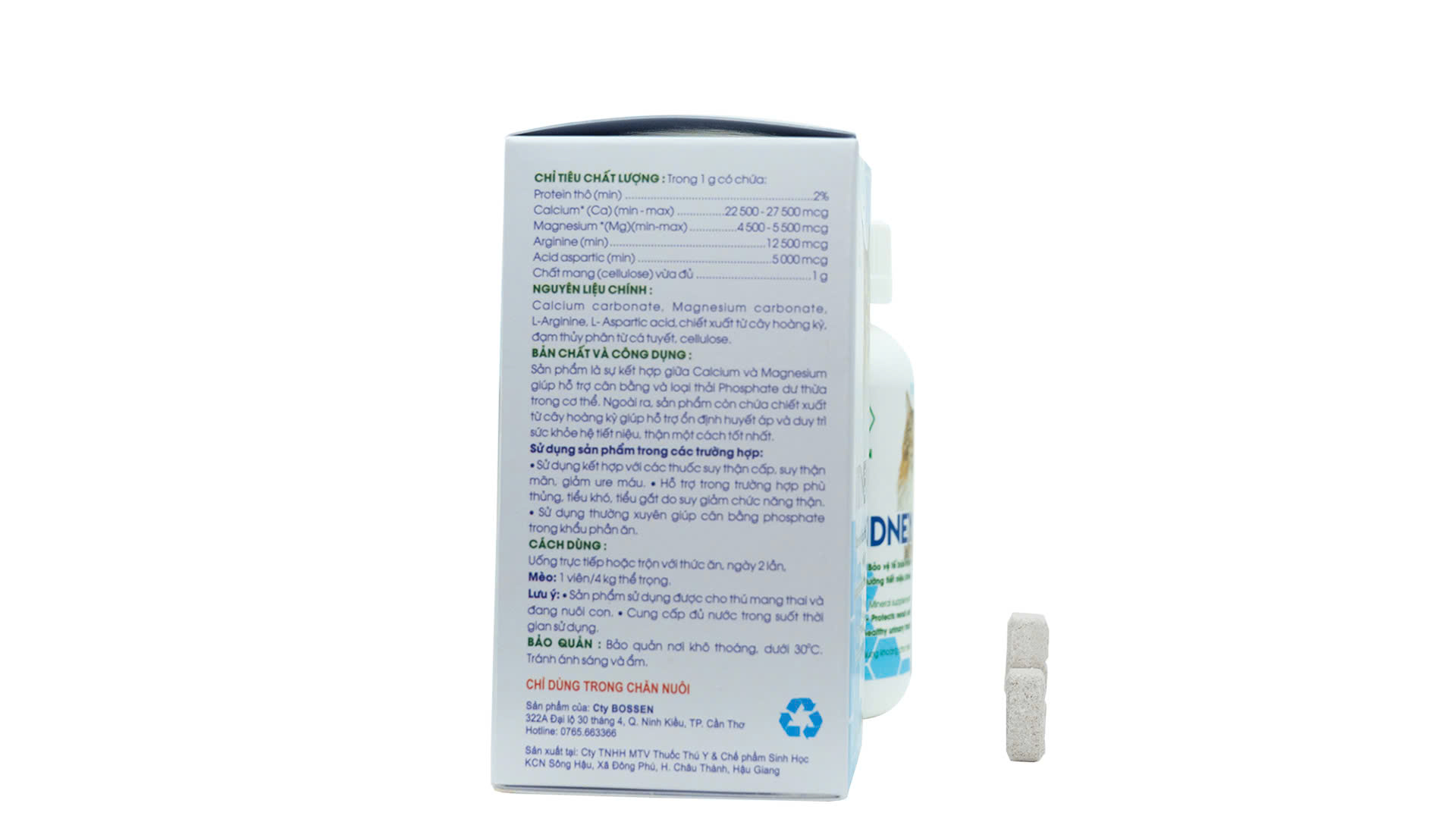 Thành phần: Trong 1 g có chứa: Protein thô (min) ………………………..2% Calcium (Ca) (min - max) …..22 500 - 27 500 mcg Magnesium (Mg)(min-max) …..4 500 - 5 500 mcg Arginine (min) ....12 500mcg Acid aspartic (min) ……………………5 000 mcg Chất mang (cellulose) vừa đủ ……….……1 g NGUYÊN LIỆU CHÍNH: Calcium carbonate, Magnesium carbonate, L-Arginine, L- Aspartic acid, chiết xuất từ cây hoàng kỳ, đạm thủy phân từ cá tuyết, cellulose. Công dụng: Sản phẩm là sự kết hợp giữa Calcium và Magnesium giúp hỗ trợ cân bằng và loại th.ải Phosphate dư thừa trong cơ thể. Ngoài ra, sản phẩm còn chứa chiết xuất từ cây hoàng kỳ giúp hỗ trợ ổn định huyết áp và duy trì sức khỏe hệ tiết niệu, thận một cách tốt nhất. Sử dụng sản phẩm trong các trường hợp: · Sử dụng kết hợp với các th-uốc suy thận cấp, suy thận mãn, giảm ure máu. · Hỗ trợ trong trường hợp p.h.ù thủng, ti.ểu khó, ti.ểu gắt do suy giảm chức năng th.ận. · Sử dụng thường xuyên giúp cân bằng phosphate trong khẩu phần ăn. L.i.ề.u dùng:. Mèo: 1 viên/4 kg thể trọng. Lưu ý: · Sản phẩm sử dụng được cho thú ma.ng th.ai và đang nuôi con. · Cung cấp đủ nước trong suốt thời gian sử dụng. Bảo quản: Bảo quản nơi khô thoáng, dưới 30 độ C. Tránh ánh sáng và ẩm.