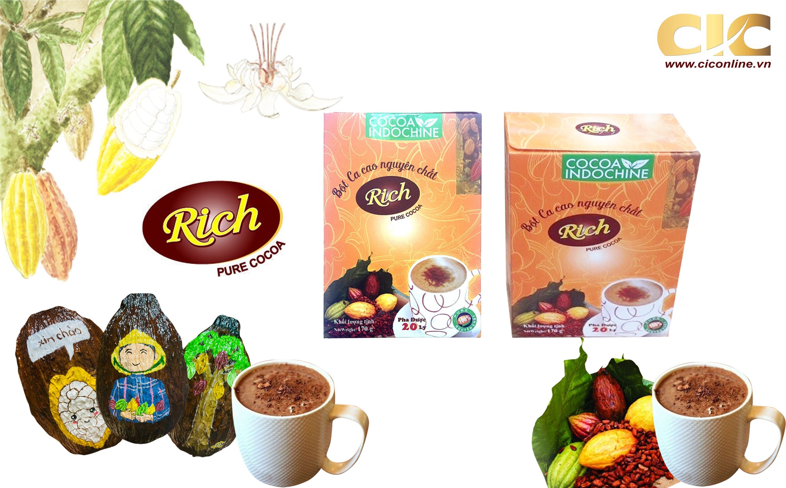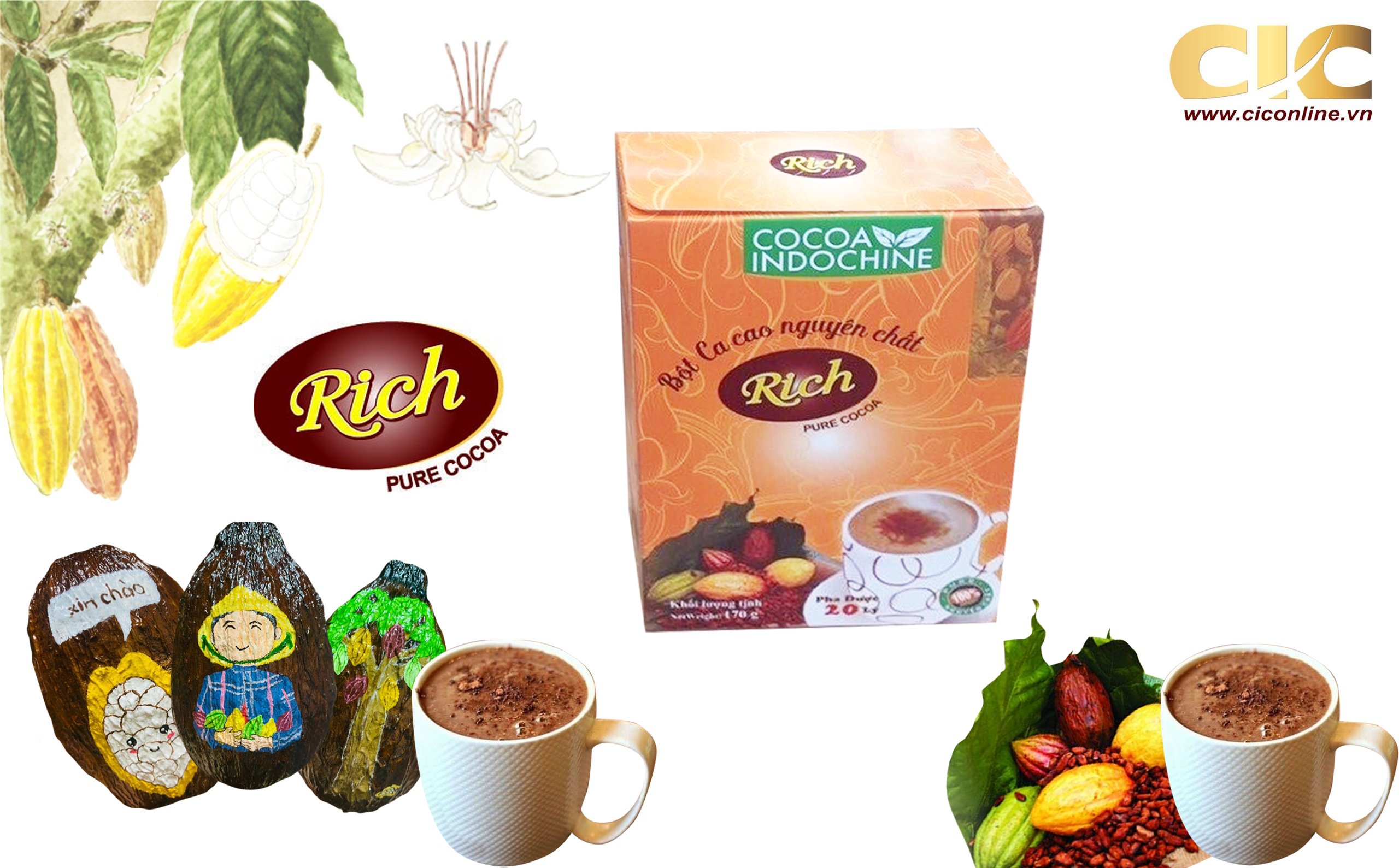 - Bột Cacao Hòa Tan Nguyên Chất Rich Cocoa Indochine (Hộp 170g) có mùi vị thơm ngon, giàu dinh dưỡng với thành phần bột Cacao thiên nhiên nguyên chất, không đường, giàu chất xơ giúp mang đến một thức