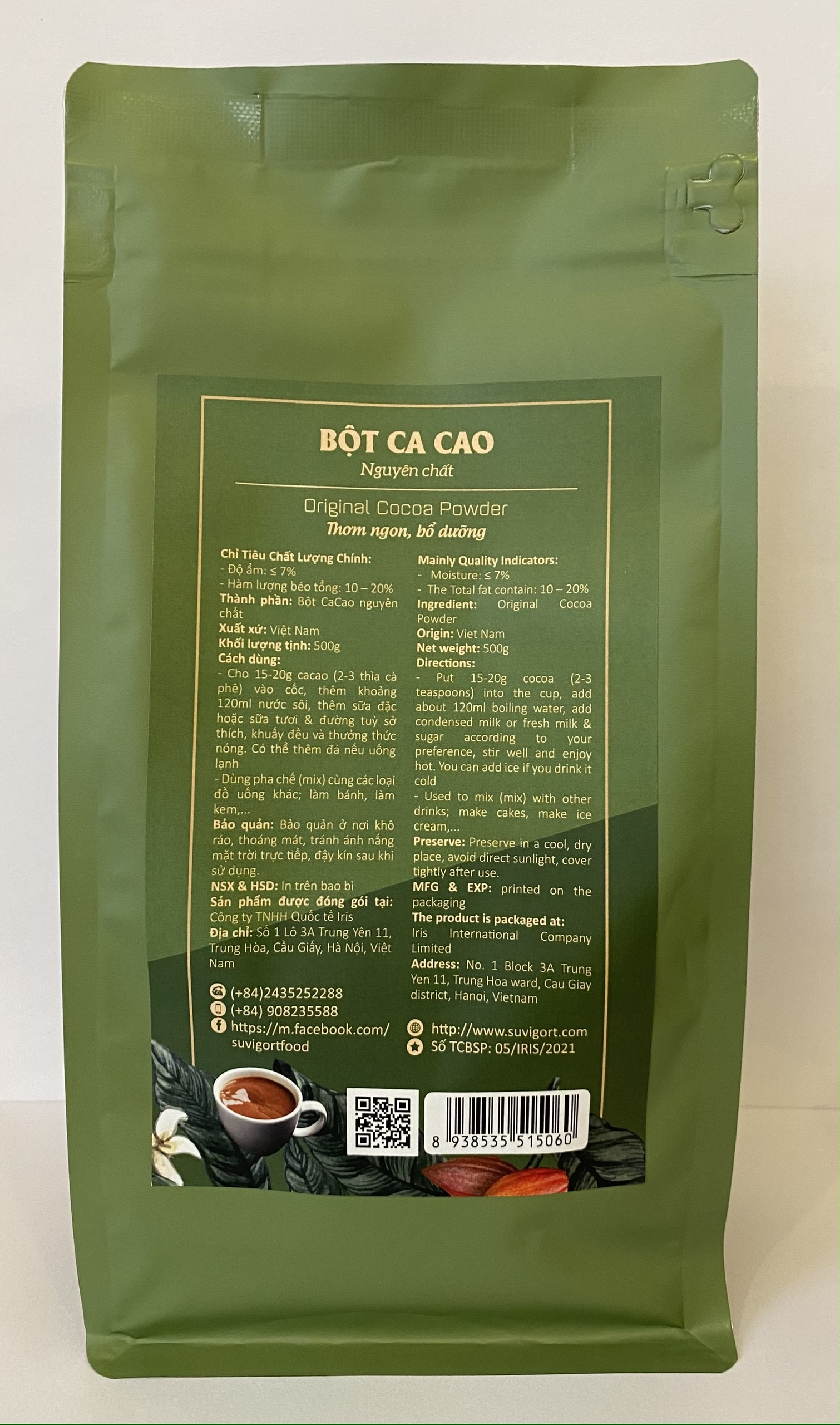 - Tên sản phẩm: Cacao nguyên chất. - Pha chế: Pha truyền thống, uống với đường hay sữa (nóng, đá) tùy thích. - Số công bố: 23/TN/2019. - Quản lý sản xuất theo tiêu chuẩn HACCP. -