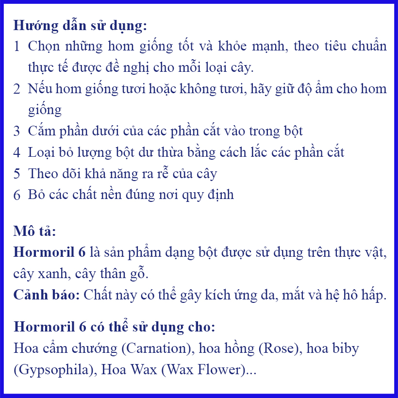 BỘT KÍCH RỄ ISRAEL DÀNH CHO CÂY THÂN GỖ – HORMORIL T6 – Nhập khẩu: Israel – Chức năng: dùng kích thích ra rễ, giúp rễ cây phát triển nhanh và an toàn 90%. Đặc