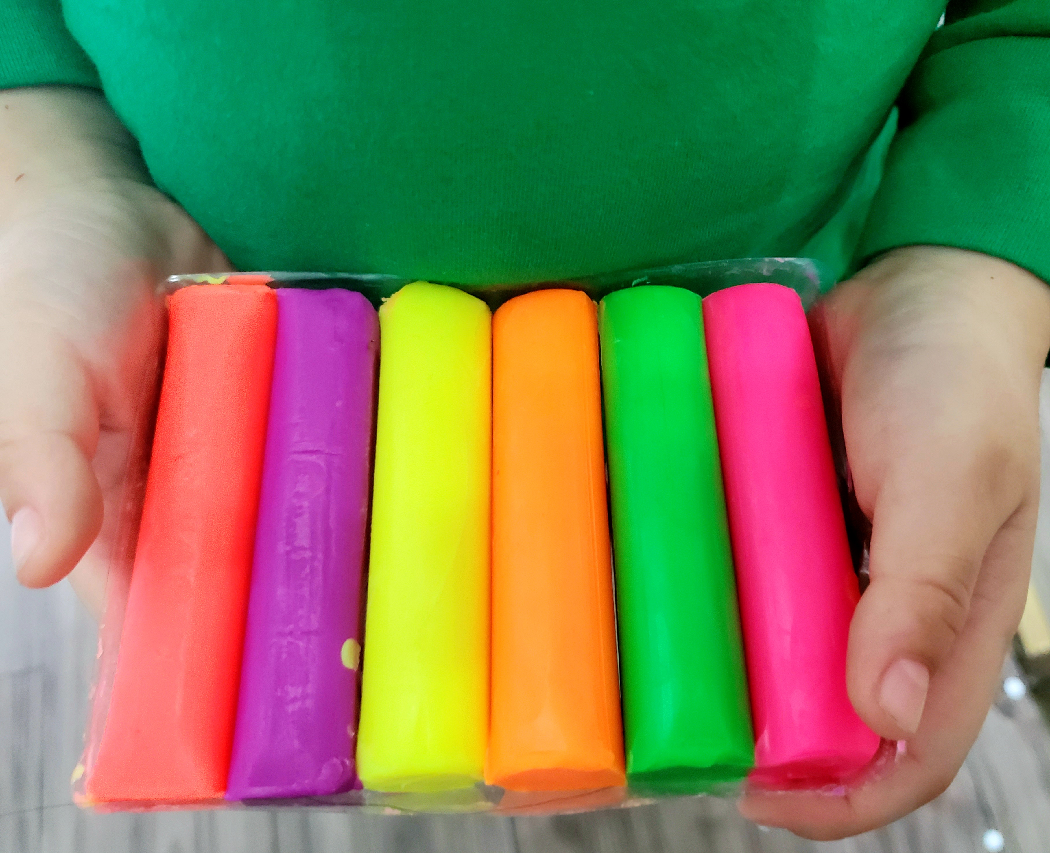 - Set bột nặn không khô gồm 6 màu (hồng, xanh lá, cam, vàng, đỏ, tím) giúp bé học màu sắc (thị giác).