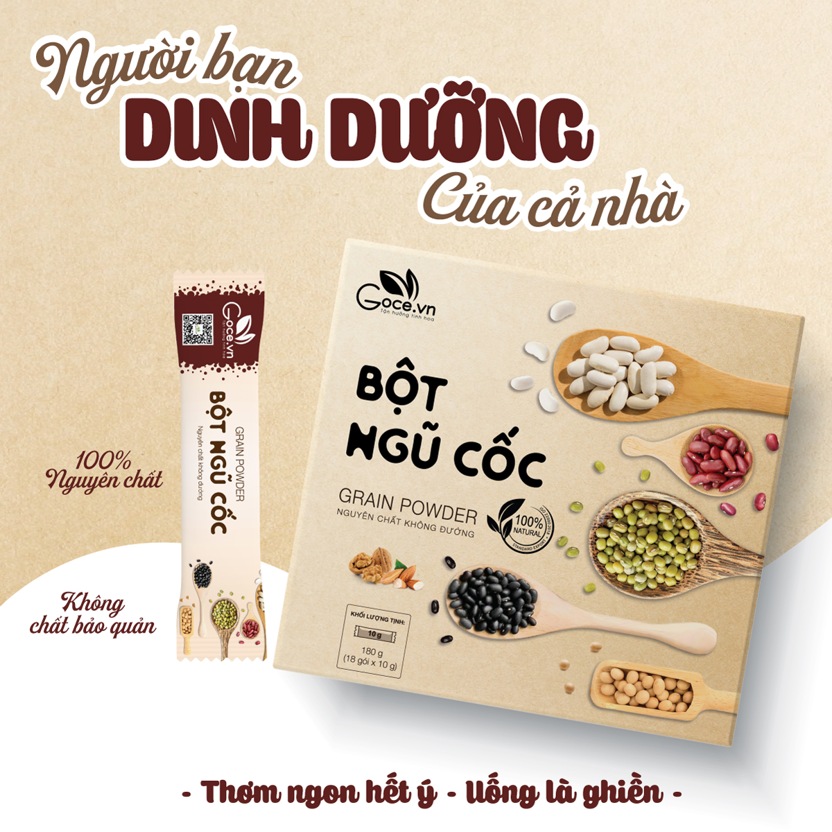 THÔNG TIN SẢN PHẨM BỘT NGŨ CỐC: - Khối lượng: 180g (18 gói x 10g). - Thành phần: 100% nguyên chất từ ngũ cốc: Đậu xanh, Đậu nành, Đậu đen, Đậu trắng, Đậu đỏ, Óc chó,