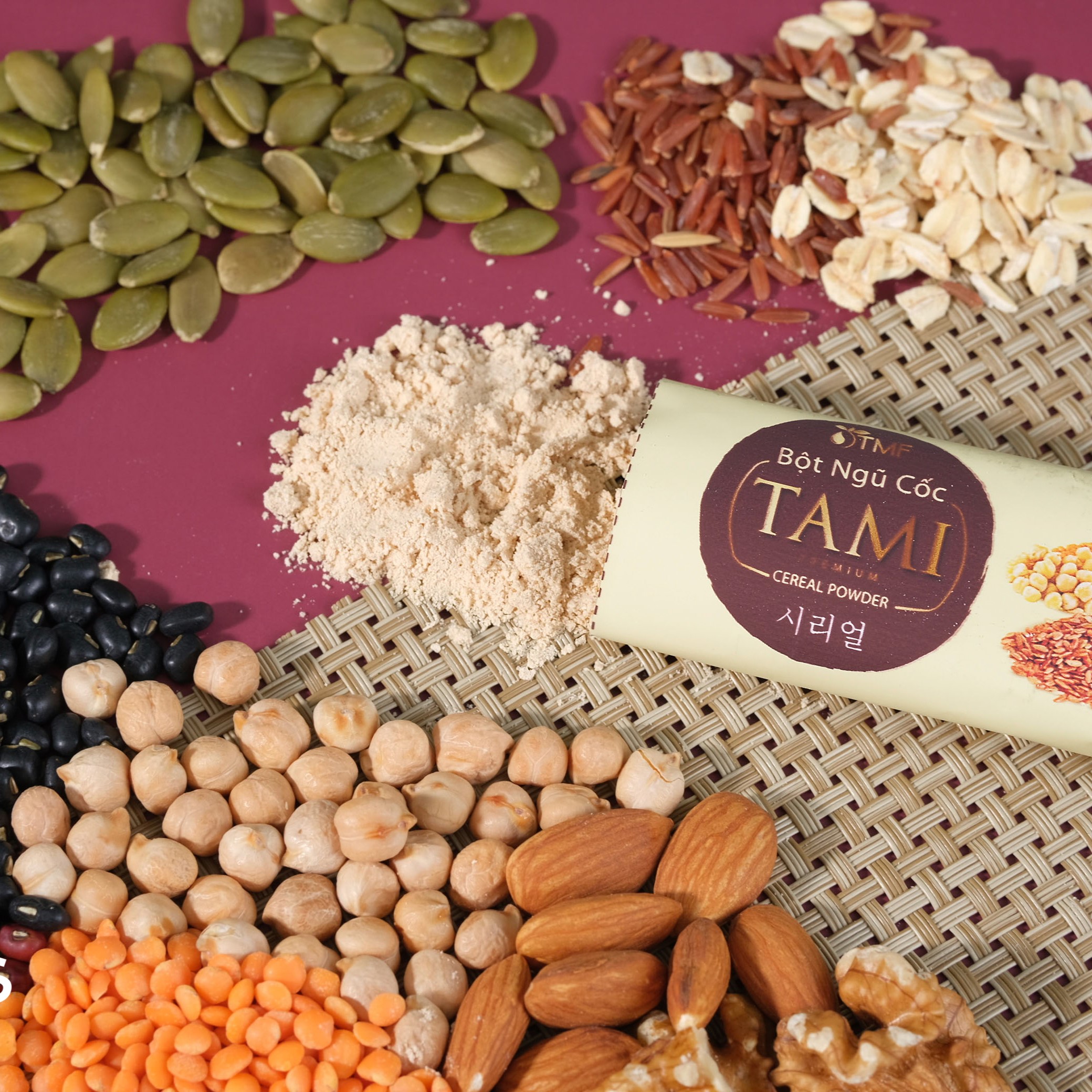 Bột ngũ cốc Tami có thành phần 100% thiên nhiên là các loại hạt đã được ngâm nảy mầm (gạo lứt, đậu đỏ, đậu gà); đậu lăng, yến mạch, óc chó, hạnh nhân, hạt bí,... Việc ngâm nảy mầm các loại hạt giúp lo...