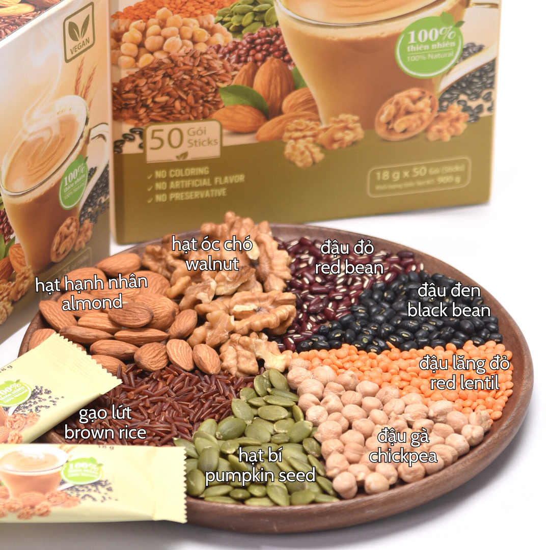 6. Người hay di chuyển nhiều nên dùng thay đồ ăn lạ không hợp khẩu vị hoặc thay thế mì ăn liền     Quy cách đóng gói: Hộp 50 gói x 18g. Một gói tương đương với một ly sữa ngũ cốc. Hướng dẫn sử dụng: Pha 1 gói vào 150 ml nước nóng, khuấy đều, uống liền. Thành phần: Các loại hạt nảy mầm (gạo lứt, đậu đỏ, đậu gà); đậu đen xanh lòng, đậu lăng, yến mạch, óc chó, hạnh nhân, hạt bí đỏ, đường vàng thô. Bảo quản: nơi khô ráo và thoáng mát. Ngày sản xuất: xem trên bao bì Hạn sử dụng: 18 tháng kể từ ngày sản xuất   Sản phẩm làm hoàn toàn tự nhiên, không hoá chất. Sản xuất tại: CÔNG TY TNHH THỰC PHẨM TÂM MINH. B2-1, lô A, đường N5B, khu công nghiệp Lê Minh Xuân 3, huyện Bình Chánh, TP.HCM