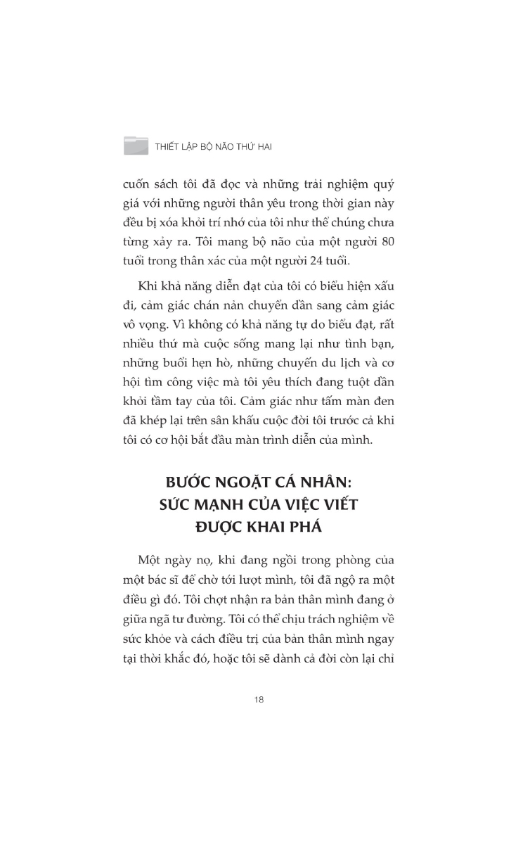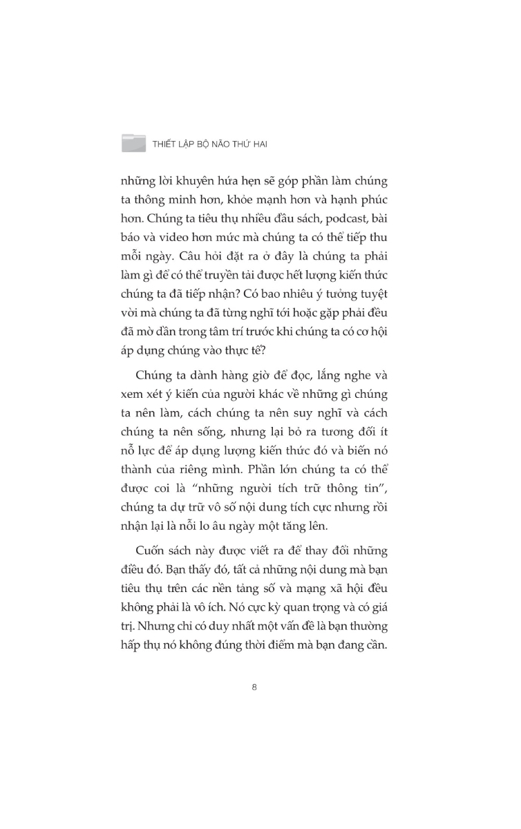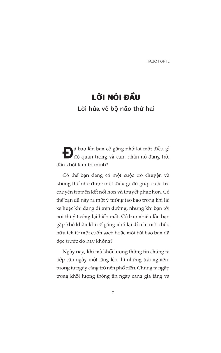 Buiding A Second Brain - Thiết Lập Bộ Não Thứ Hai GIỚI THIỆU SÁCH: Trong thời đại công nghệ thông tin phát triển mạnh mẽ, việc truy cập vào kho tàng kiến thức khổng lồ trở nên dễ dàng hơn bao giờ hết, nhưng cũng đặt ra thách thức về việc quản lý và sử dụng thông tin. Building A Second Brain - Thiết Lập Bộ Não Thứ Hai của Tiago Forte là một cuốn sách mang tính cách mạng, cung cấp hướng dẫn chi tiết về cách xây dựng hệ thống quản lý thông tin cá nhân hiệu quả. Cuốn sách giới thiệu khái niệm "bộ não thứ hai" - một kho lưu trữ kỹ thuật số có tổ chức và đáng tin cậy, giúp bạn lưu trữ, sắp xếp và sử dụng hiệu quả thông tin từ các ý tưởng, ghi chú sáng tạo đến kinh nghiệm quan trọng, đồng bộ hóa trên tất cả các thiết bị và nền tảng. Cuốn sách sẽ giúp bạn xây dựng một hệ thống lưu trữ thông tin cá nhân hiệu quả, tổ chức và lọc thông tin dễ dàng tìm kiếm và sử dụng, áp dụng hệ thống Second Brain vào cuộc sống hàng ngày để đưa ra quyết định và giải quyết vấn đề hiệu quả hơn. Bạn sẽ học cách tự động hóa và tối ưu hóa quy trình lưu trữ và xử lý thông tin, biến những gì bạn biết thành những cải tiến mạnh mẽ và có ý nghĩa trong công việc và cuộc sống. Về tác giả Tiago Forte, ông là một trong những chuyên gia hàng đầu về hiệu suất cá nhân, đã giảng dạy cho hàng nghìn người về các nguyên tắc thời gian và công nghệ tiên tiến nhất để cách mạng hóa năng suất, sự sáng tạo và hiệu quả cá nhân. Ông từng làm việc với nhiều tổ chức lớn như Genentech, Tập đoàn Toyota Motor và Ngân hàng Phát triển Inter-American. Tiago Forte cũng xuất hiện trên nhiều ấn phẩm uy tín như New York Times, The Atlantic và Harvard Business Review.