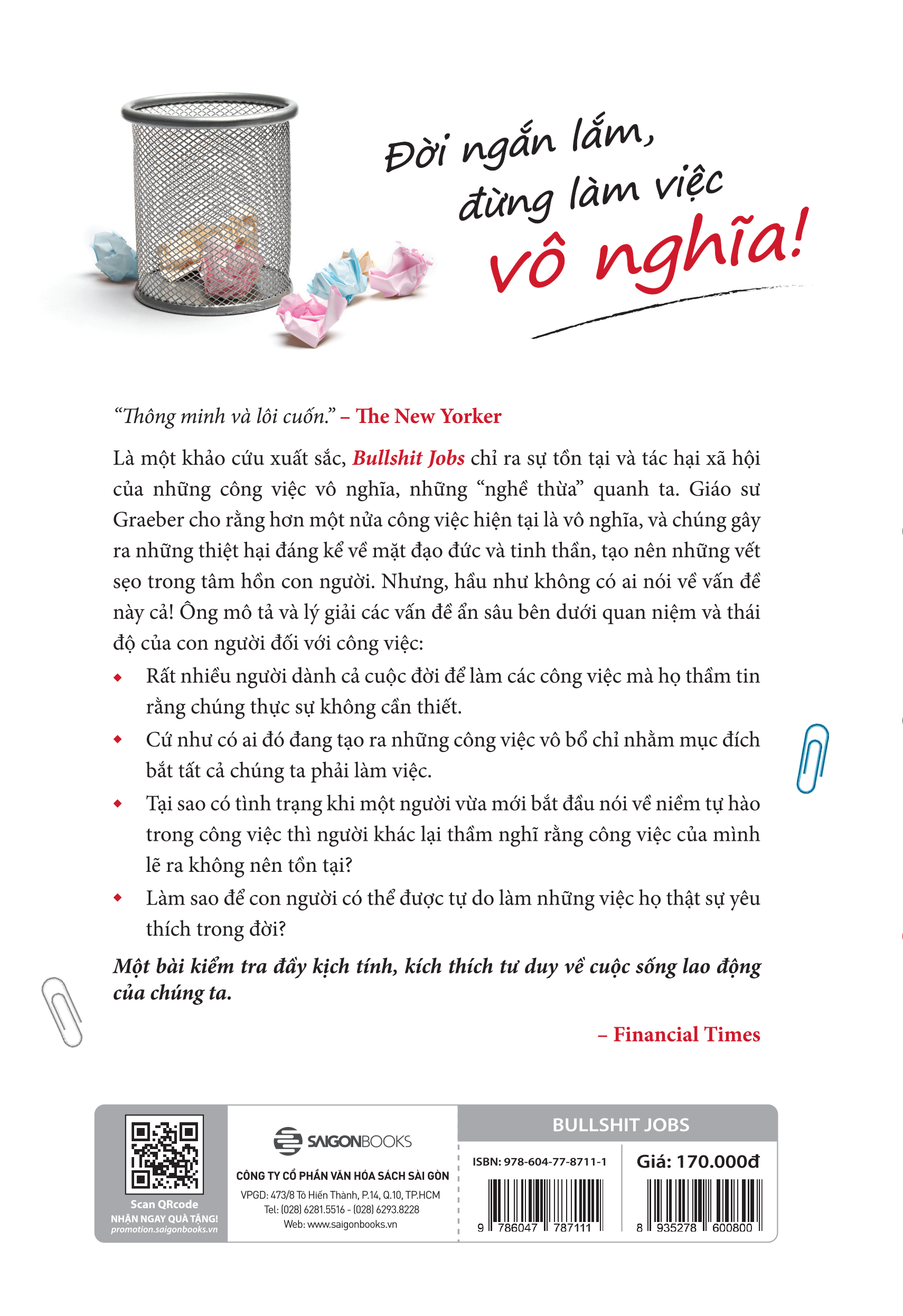 Là một khảo cứu xuất sắc, Bullshit Jobs: Đời ngắn lắm, đừng làm việc vô nghĩa! chỉ ra sự tồn tại và tác hại xã hội của những công việc vô nghĩa, những “nghề thừa” quanh ta. Giáo sư David Graeber cho rằng hơn một nửa công việc hiện tại là vô nghĩa, và chúng gây ra những thiệt hại đáng kể về mặt đạo đức và tinh thần, tạo nên những vết sẹo trong tâm hồn con người. Nhưng, hầu như không có ai nói về vấn đề này cả! Ông mô tả và lý giải các vấn đề ẩn sâu bên dưới quan niệm và thái độ của con người đối với công việc: Rất nhiều người dành cả cuộc đời để làm các công việc mà họ thầm tin rằng chúng thực sự không cần thiết.   Cứ như có ai đó đang tạo ra những công việc vô bổ chỉ nhằm mục đích bắt tất cả chúng ta phải làm việc.   Tại sao có tình trạng khi một người vừa mới bắt đầu nói về niềm tự hào trong công việc thì người khác lại thầm nghĩ rằng công việc của mình lẽ ra không nên tồn tại?   Làm sao để con người có thể được tự do làm những công việc họ thật sự yêu thích trong đời?   Bullshit Jobs: Đời ngắn lắm, đừng làm việc vô nghĩa! là một bài kiểm tra đầy kịch tính, kích thích tư duy về cuộc sống lao động của chúng ta.   ĐỊNH NGHĨA VỀ BULLSHIT JOBS - NHỮNG VIỆC VÔ NGHĨA CỦA GIÁO SƯ DAVID GRAEBER:   Định nghĩa tạm thời thứ nhất: Công việc vô nghĩa là một hình thức việc làm hoàn toàn vô nghĩa, không cần thiết hoặc có tính độc hại mà đến cả người làm công việc đó cũng không thể biện minh cho sự tồn tại của nó.   Định nghĩa tạm thời thứ hai: Công việc vô nghĩa là một hình thức việc làm hoàn toàn vô nghĩa, không cần thiết hoặc có tính độc hại mà đến cả người làm công việc đó  cũng không thể biện minh cho sự tồn tại của nó mặc dù họ cảm thấy buộc phải giả vờ rằng nó không phải việc vô nghĩa.   Định nghĩa cuối cùng: Công việc vô nghĩa là một hình thức của việc làm có trả lương, và nó hoàn toàn vô nghĩa, không cần thiết hoặc có tính độc hại mà đến cả người làm công việc đó cũng không thể biện minh cho sự tồn tại của nó, mặc dù họ cảm thấy buộc phải giả vờ rằng nó không phải việc vô nghĩa, như một phần của điều kiện làm việc.   Công việc không chỉ là một quá trình sinh kế, mà nó còn là một trong những yếu tố đóng góp quan trọng nhất cho đời sống nội tâì thế nếu bạn tự cảm thấy bản thân đang làm một công việc vô nghĩa và chẳng có tí động lực nào để làm việc đó thì hãy dũng cảm đưa ra quyết định. Vì bị từ chối công việc là bị từ chối nhiều hơn những thứ mà công việc có thể mua: Đó là bị từ chối khả năng tự định nghĩa và lòng tự trọng của một con người.