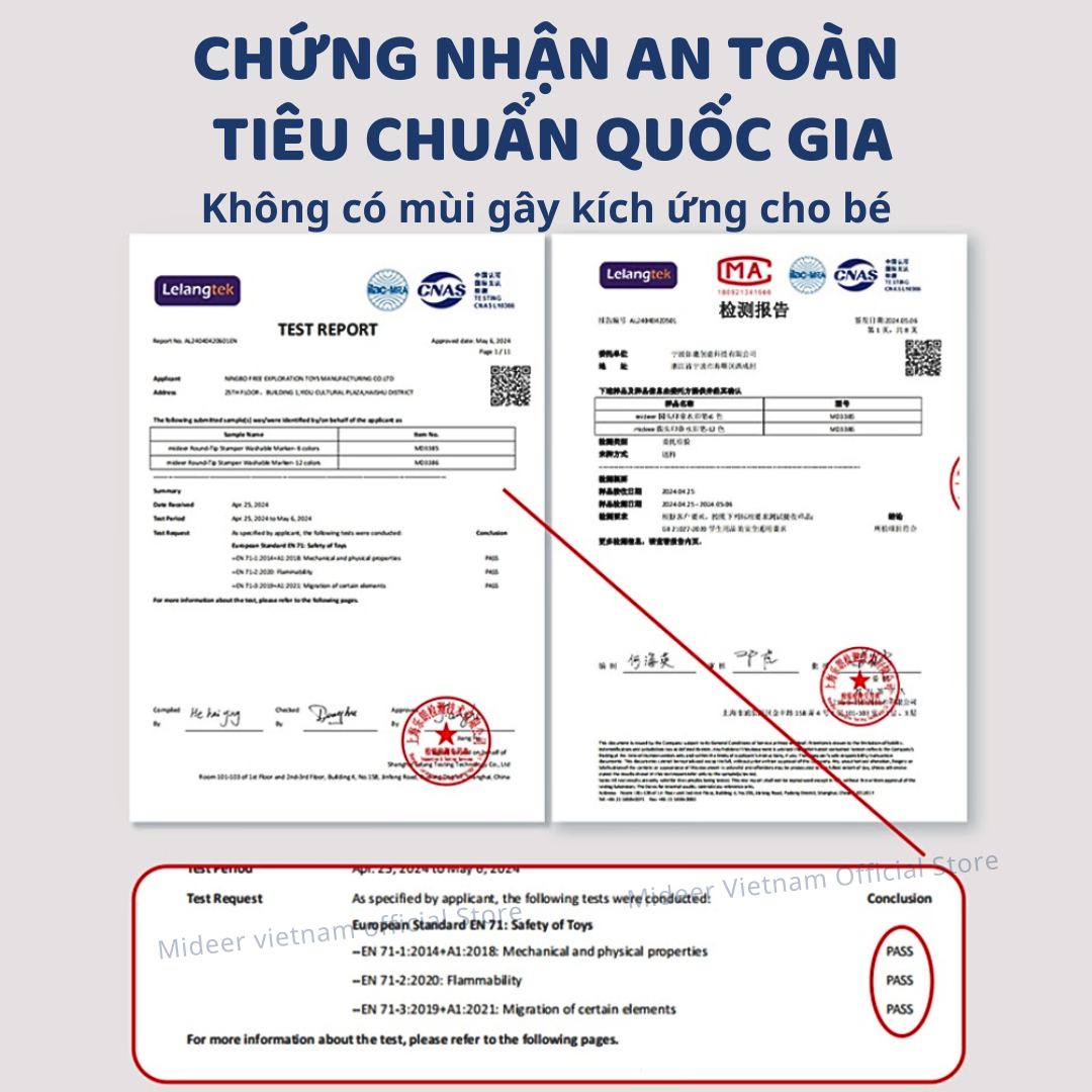 - Màu lên chuẩn: Thúc đẩy nhận biết màu cơ bản, khuyến khích bé khám phá và sáng tạo. Bút màu nước 2 đầu, kèm dấu cho bé xóa được Mideer