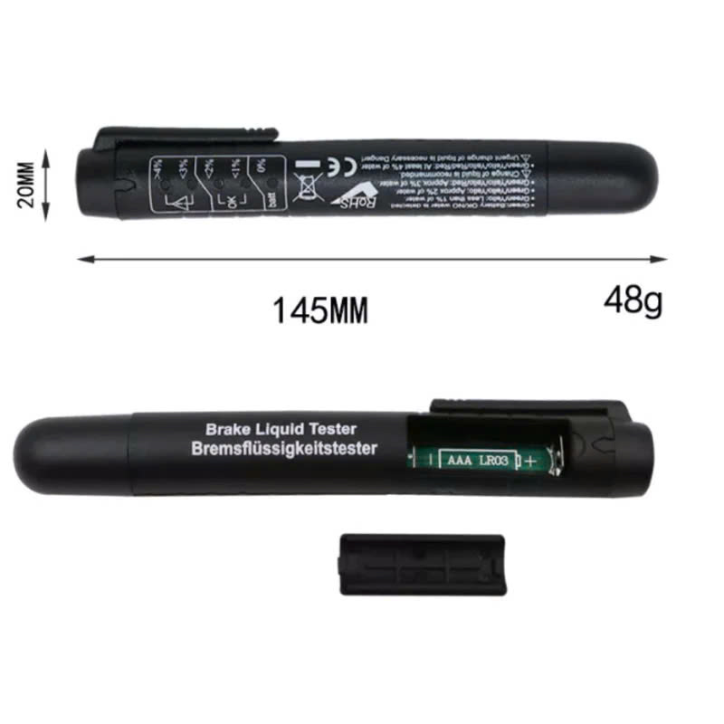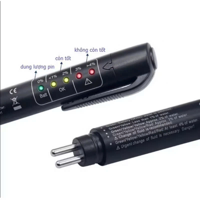 Vì vậy nguyên nhân dẫn đến hiện tượng mất phanh , phanh không ăn , hiện tượng hỏng tổng bơm hoặc giảm tuổi thọ tổng bơm đều do chất lượng dầu phanh kém như : dầu phanh dùng lâu có hàm lượng nước cao gây mất lực nén, trong dầu phanh có nhiều kim loại do quá trình sử dụng bị mài mòn vv..vv. Hiểu được điều đó chúng tôi xin giới thiệu đến các bạn sản phẩm thiết bị thử dầu phanh cho ô tô xe máy , kiểm tra để biết được dầu phanh còn sử dụng tốt hay cần thay thế để đảm bảo an toàn cũng như tiết kiệm chi phí tránh hư hỏng tổng bơm dầu trên xe của bạn Ngoài ra bạn cũng có thể dùng bút để thử xem loại dầu phanh bạn mua có tốt hay không trước khi cho vào xe để sử dụng  Các tính năng: 1. Kiểm tra chất lượng dầu phanh. 2. 5 LED đèn hiển thị mức độ phần trăm của độ ẩm trong dầu phanh.( Nếu độ ẩm cao - dầu phanh là chất dễ hút nước) sẽ dẫn đến điểm sôi thấp hơn, làm ảnh hưởng đến hiệu suất phanh  Hướng dẫn sử dụng: 3. Ấn nút Nguồn (power on), đèn LED màu xanh sẽ sáng lên. 4. Nhúng đầu bút thử vào bình chứa dầu phanh, đợi 10s, sau đó kết quả sẽ được hiển thị trên thân thiết bị bằng Đèn Led. - Nếu báo đèn Led màu xanh lá cây, hàm lượng nước , kim loại trong dầu phanh < 1.5%, nghĩa là dầu phanh còn tốt. - Nếu báo đèn Led màu vàng, hàm lượng nước , kim loại trong dầu phanh = 1.5% đến 3%, nghĩa là dầu phanh vẫn có thể tiếp tục sử dụng, tuy nhiên cần kiểm tra lại sau sáu tháng. - Nếu báo đèn Led màu đỏ, hàm lượng nước , kim loại trong dầu phanh > 3%, nghĩa là dầu phanh đã kém chất lượng, cần phải được thay thế gấp để đảm bảo an toàn khi đi xe và hệ thống phanh - Thiết bị thử dầu phanh , vệ sĩ bảo vệ bạn trên mọi cung đường * Thông số kỹ thuật: - Loại dầu phanh có thể áp dụng: DOT 3, DOT4, DOT5. - Chạy pin AAA  - Nếu đèn Led màu đỏ nhấp nháy, bạn cần thay pin ngay.