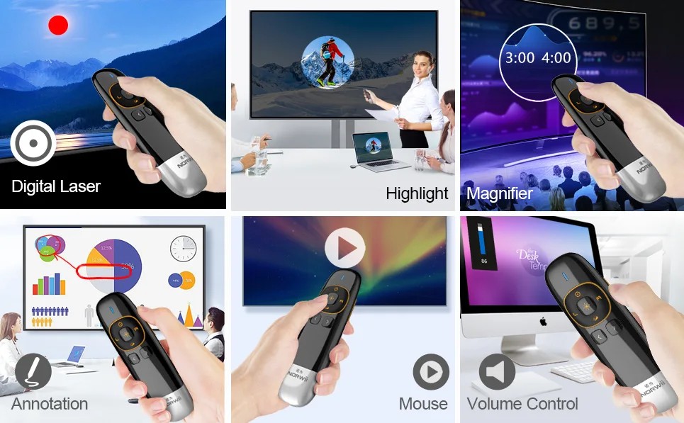 Bút trình chiếu laser Norwii N27 là thiết bị lý tưởng cho các buổi thuyết trình chuyên nghiệp, với nhiều tính năng nổi bật: - Ứng dụng thông minh: Điều khiển trình chiếu dễ dàng