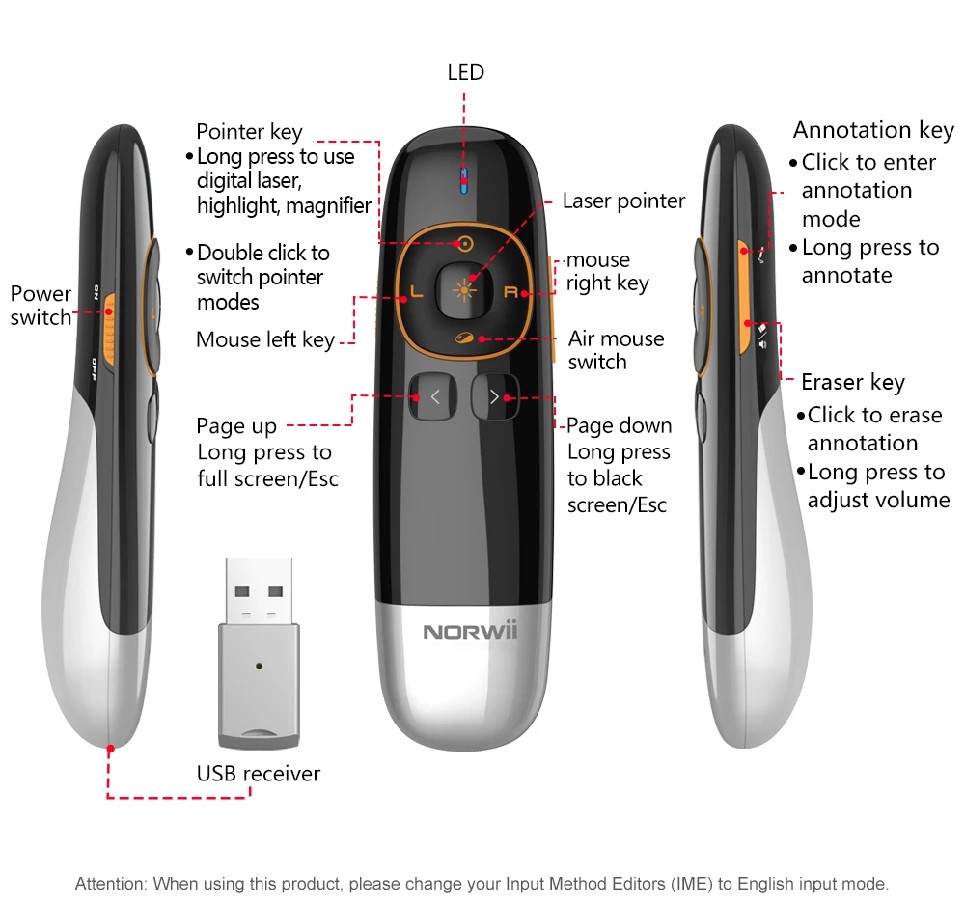 - Nhập dữ liệu vào ô văn bản hoặc chọn từ danh sách thả xuống. Lưu ý rằng các phím tắt đã được hệ điều hành sử dụng sẽ không thể nhập vào, nhưng các phím tắt khác sẽ đáp ứng tốt nhu cầu của người dùng thông thường. Nhờ tính năng tùy chỉnh này, bạn có thể tối ưu hóa trải nghiệm sử dụng bút trình chiếu Norwii N86S để phù hợp với nhu cầu cá nhân và các ứng dụng khác nhau. Bút Trình Chiếu Kiêm Chuột Bay Norwii N86S Được Thiết Kế Để Sử Dụng Cho Tất Cả Các Loại Màn Hình Như Màn Led, Màn Chiếu Norwii N86S: Bút Trình Chiếu Cho Màn Hình LCD/LED Và Màn Chiếu Bút trình chiếu Norwii N86S được thiết kế để hoạt động hiệu quả trên màn hình LCD/LED và màn chiếu. Thiết bị hỗ trợ nhiều chức năng tiện ích bao gồm laser vật lý, laser kỹ thuật số, đánh dấu nổi bật, phóng to, đánh dấu toàn màn hình, chuột không dây và điều khiển âm lượng.