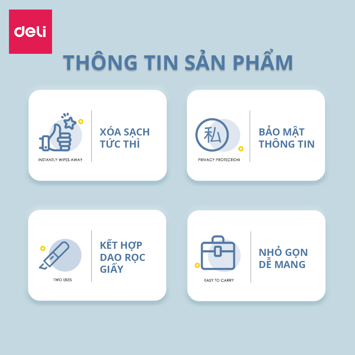 Tự hào là một trong những nhãn hàng văn phòng phẩm lớn nhất tại Việt Nam, @Delivietnam không ngừng nỗ lực và phát triển trong lĩnh vực phân phối các sản phẩm cho các đơn vị văn phòng, trường học,... Với phương châm sản xuất những sản phẩm chất lượng tốt nhất và luôn đặt khách hàng làm trọng tâm, sứ mệnh của Deli là làm hài hòng người tiêu dùng toàn cầu với những sản phẩm chất lượng cao, độ tin cậy tuyệt đối và thân thiện với người dùng. Khách hàng lựa chọn các sản phẩm của @Delivietnam sẽ được cam kết: Sản phẩm chính hãng từ nhà máy Deli, nguồn gốc rõ ràng và chất lượng đạt tiêu chuẩn. Giá cả hợp lý, cạnh tranh, rẻ nhất thị trường. Hỗ trợ đổi trả hàng cho những sản phẩm bị thiếu.