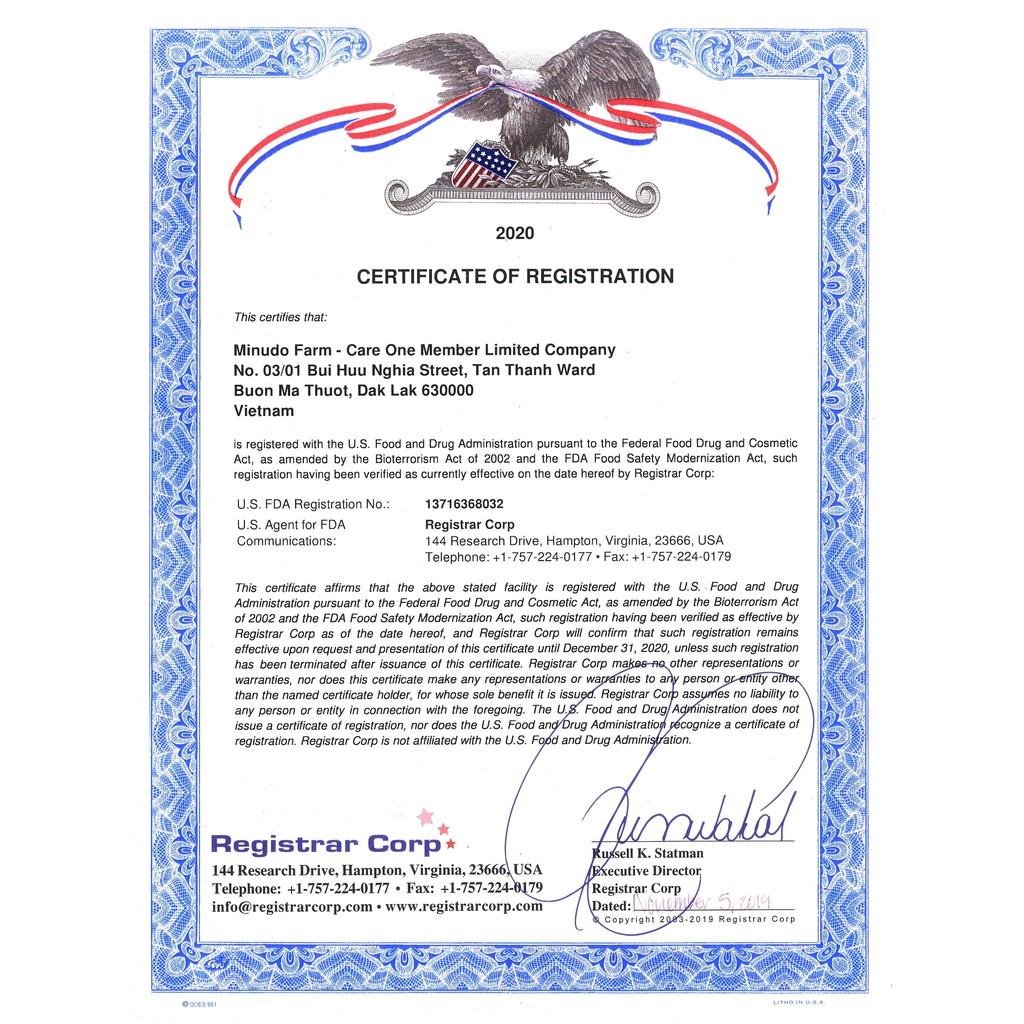 100% Quả chín mới được thu hoạch để đảm bảo hương vị ngon nhất. ️Quy trình sản xuất đạt tiêu chuẩn Châu Âu: HACCP Codex Alimentarius: Chứng nhận vệ sinh an toàn thực phẩm, được Quốc tế công nhận. ISO 22000-2018: Chứng nhận quản lý chất lượng về quy trình sản xuất. FDA (Mỹ): Chứng nhận vệ sinh an toàn thực phẩm của Mỹ. Chứng nhận cà phê đặc sản: Chứng nhận cà phê đạt chuẩn đặc sản trong 3 năm liên tiếp. HACCP: Chứng nhận vệ sinh an toàn thực phẩm Việt Nam.