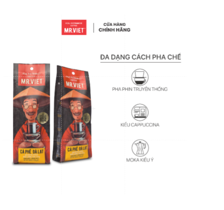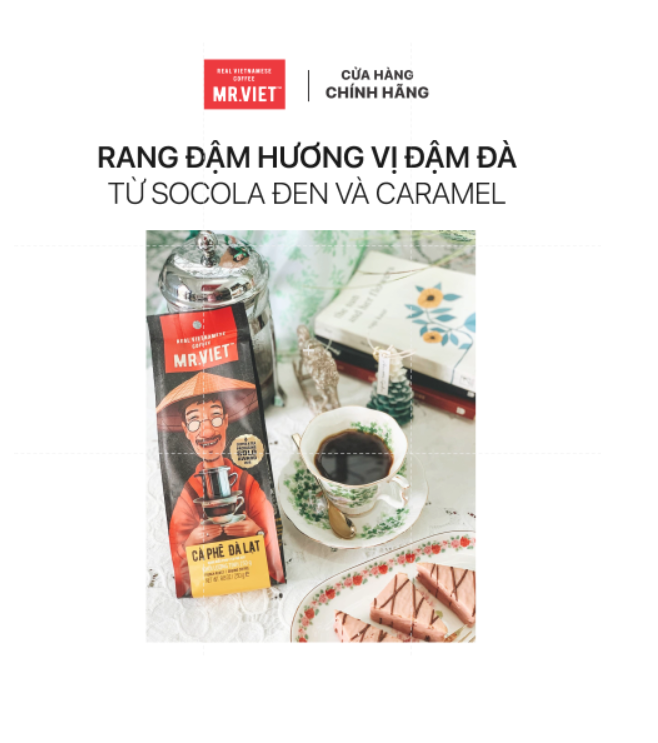 - Cà Phê Rang Xay MR.VIET là dòng cà phê rang xay đặc biệt với thành phần Arabica 70%, Robusta 30%, vị cà phê mạnh mẽ với hương sô-cô-la & caramen.