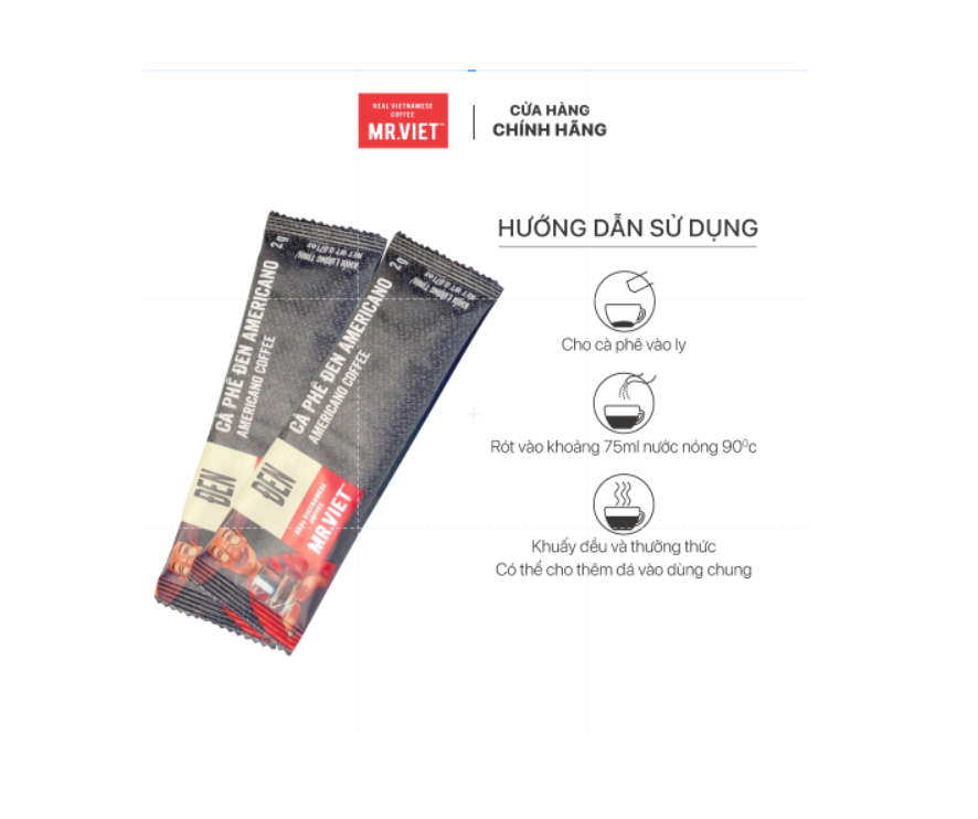 Cà phê hòa tan, cà phê đen Espresso vị đậm đà - MR.VIET Coffee (20 gói/hộp x 2g) Thành phần: 100 % cà phê đen hòa tan. Cách pha chế: Bước 1: cho 1 gói