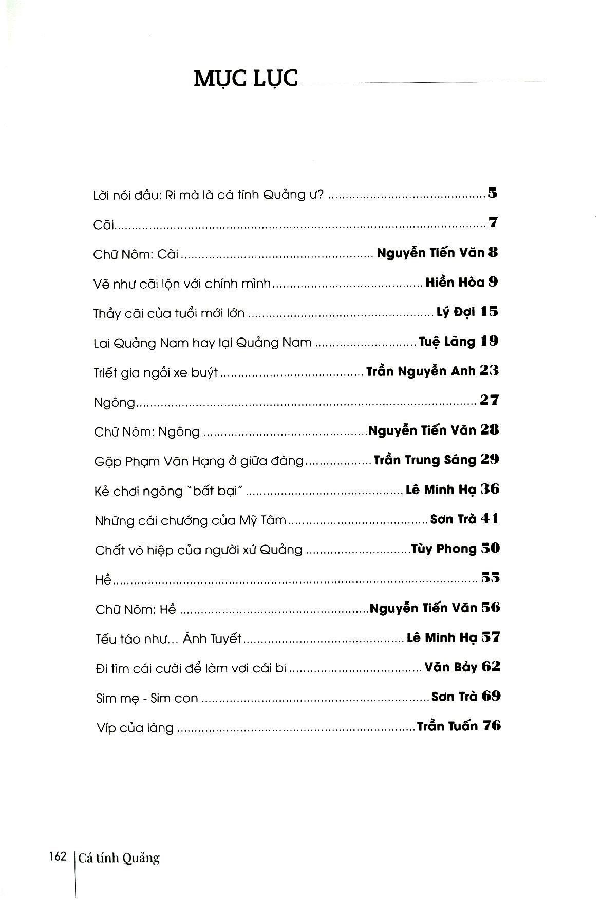 Cá Tính Quảng Xứ Quảng trong lịch sử đã là sự chung sống của Chăm-Việt, là cửa ngõ của giao thuơng quốc tế với nhiều bến cảng lớn, nơi Hội An là thành phố toàn cầu từ thời phong kiến, nên tinh thần dân chủ, việc chấp nhận sự khác biệt đã thành bản sắc. Như là một tiếp nối, các nhân vật trong sách này cũng được chọn lựa với tinh thần bình đẳng và dân chủ như vậy. Trong công việc riêng, mỗi nhân vật có những đóng góp, những gợi hứng đáng trân quý, các tác giả dựa vào đó để viết về họ, chứ không có ý phân “chiếu trên, chiếu dưới”. Thật vậy, tự trong mỗi ngành nghề thì còn có thể bàn về chuyện cao thấp, lớn nhỏ, chứ cà một xứ sở, một vùng văn hóa, với lịch sử dài và phức tạp, đâu dễ để nhận định ai quan trọng ai tầm thường, ai lớn ai nhỏ. Mà nếu thật sư muốn phân cao thấp, thì tiêu chí nào có thể phù hợp và công bằng với các ngành nghề, các xuất phát điểm quá khác nhau. Chính vì vậy, khi đọc sách, nếu độc giả thích nhân vật A hơn B, hoặc thấy c lớn lao hơn D, ấy cũng là bình thường, là cảm nhận riêng, chứ tự cuốn sách không hướng đến điều đó. Nhiều bài trong sách này từng được in trên báo và tạp chí, nay tác giả tự nhuận sắc để góp mặt trong tuyển tập này. Một vài bài in theo sự lựa chọn, biên tập của chính nhân vật trong bài. Sách với bìa và cover từng phần do họa sĩ Lê Kinh Tài thiết kế, biến tấu từ hình tuợng con tò he, khá phổ biến một thời tại xứ Quảng, ngày nay còn thấy nhiều ở Hội An và các chợ làng xã. Tò he có lẽ là sản phẩm đi cùng bước chân mở cõi vào Nam, mà xứ Quảng - với trắc trở của đèo Hải Vân và cuộc đối thoại trực tiếp với văn minh Chăm - là một cột mốc lớn. Nếu có một chút so sánh, có thể thấy tò he ở xứ Quảng có nhiều nét riêng so với tò he ở làng Xuân La (Phượng Dực, Phú Xuyên, Hà Nội) - vốn đuợc cho là một trong những nơi phát xuất của nghề tò he. Tìm về cá tính Quảng, bản sắc Quả đôi khi cũng là tìm về nét riêng của những vật thể và phi vật thể như vậy.