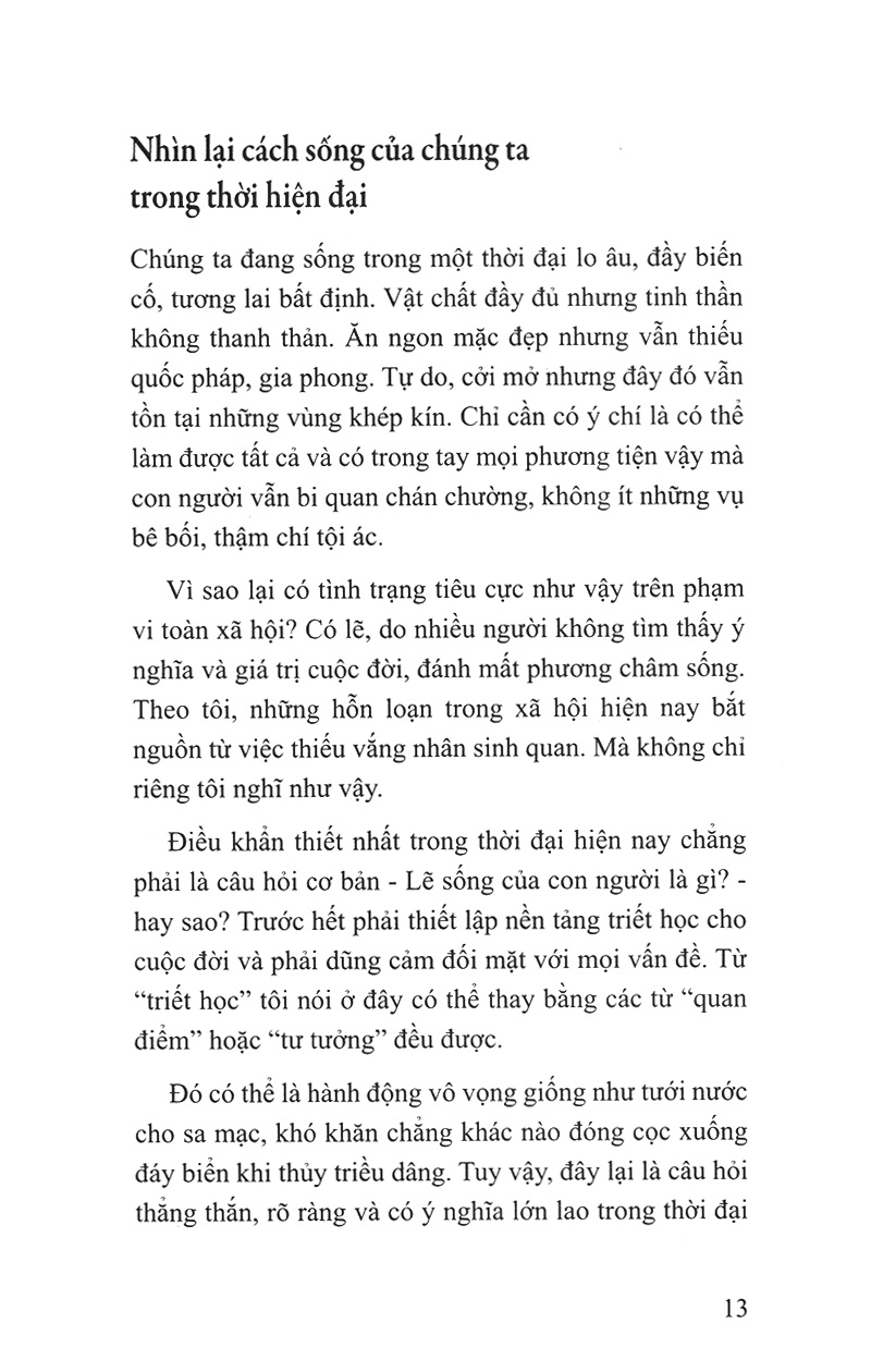 Điều khẩn thiết nhất trong thời đại hiện nay chẳng phải là câu hỏi cơ bản – Lẽ sống của con người là gì? – hay sao? Trước hết phải thiết lập nền tảng triết học cho cuộc đời và phải dũng cảm đối mặt với mọi vấn đề. Từ “triết học” tôi nói ở đây có thể thay bằng các từ “quan điểm” hoặc “tư tưởng” đều được.