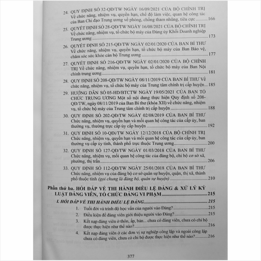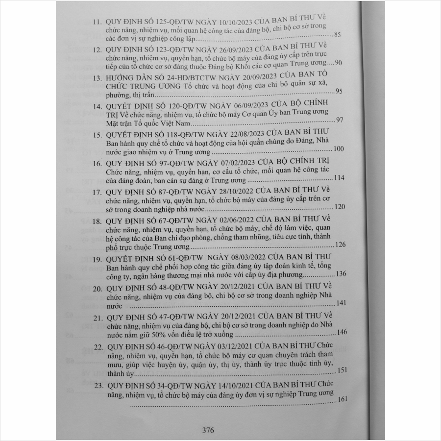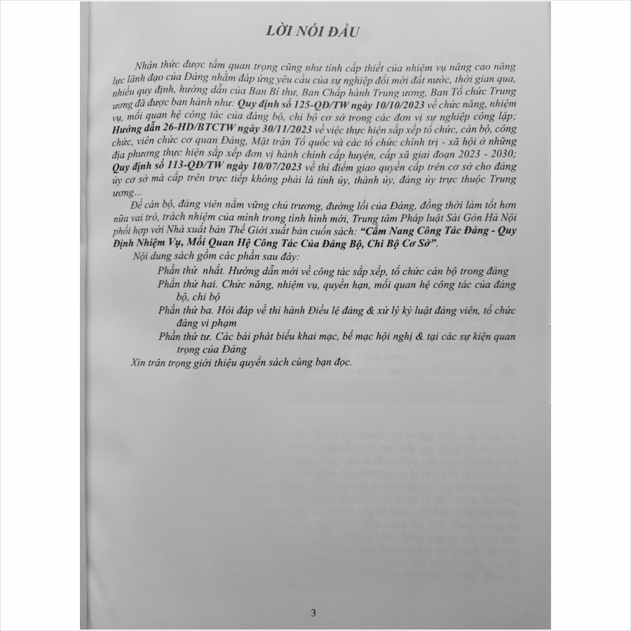- Toàn bộ sách bìa mềm khổ lớn 20 x 28 cm phân phối bởi Nhà sách Nam Việt đều được bọc sách Plastic MIỄN PHÍ và xuất hóa đơn điện tử đầy đủ, nhanh chóng. …/… Lời giới thiệu: Nhận thức được tầm quan trọng cũng như tính cấp thiết của nhiệm vụ nâng cao năng lực lãnh đạo của Đảng nhằm đáp ứng yêu cầu của sự nghiệp đổi mới đất nước, thời gian qua, nhiều quy định, hướng dẫn của Ban Bí thư, Ban Chấp hành Trung ương, Ban Tổ chức Trung ương đã được ban hành như: – Quy định số 125-QĐ/TW ngày 10/10/2023 về chức năng, nhiệm vụ, mối quan hệ công tác của đảng bộ, chi bộ cơ sở trong các đơn vị sự nghiệp công lập; – Hướng dẫn 26-HD/BTCTW ngày 30/11/2023 về việc thực hiện sắp xếp tổ chức, cán bộ, công chức, viên chức cơ quan Đảng, Mặt trận Tổ quốc và các tổ chức chính trị – xã hội ở những địa phương thực hiện sắp xếp đơn vị hành chính cấp huyện, cấp xã giai đoạn 2023 – 2030; – Quy định số 113-QĐ/TW ngày 10/07/2023 về thí điểm giao quyền cấp trên cơ sở cho đảng ủy cơ sở mà cấp trên trực tiếp không phải là tỉnh ủy, thành ủy, đảng ủy trực thuộc Trung ương… Để cán bộ, đảng viên nắm vững chủ trương, đường lối của Đảng, đồng thời làm tốt hơn nữa vai trò, trách nhiệm của mình trong tình hình mới, Nhà sách Nam Việt xin trân trọng giới thiệu cuốn sách: Cẩm Nang Công Tác Đảng – Quy Định Nhiệm Vụ, Mối Quan Hệ Công Tác Của Đảng Bộ, Chi Bộ Cơ Sở …/… Nội dung sách gồm 4 phần: Phần thứ nhất. Hướng dẫn mới về công tác sắp xếp, tổ chức cán bộ trong đảng Phần thứ hai. Chức năng, nhiệm vụ, quyền hạn, mối quan hệ công tác của đảng bộ, chi bộ Phần thứ ba. Hỏi đáp về thi hành Điều lệ đảng & xử lý kỷ luật đảng viên, tổ chức đảng vi phạm Phần thứ tư. Các bài phát biểu khai mạc, bế mạc hội nghị & tại các sự kiện quan trọng của Đảng Cảm ơn các bạn đã ghé thăm shop Nhà sách Nam Việt ! Sách Cẩm Nang Công Tác Đảng – Quy Định Nhiệm Vụ, Mối Quan Hệ Công Tác Của Đảng Bộ, Chi Bộ Cơ Sở Sách Cẩm Nang Công Tác Đảng – Quy Định Nhiệm Vụ, Mối Quan Hệ Công Tác Của Đảng Bộ, Chi Bộ Cơ Sở