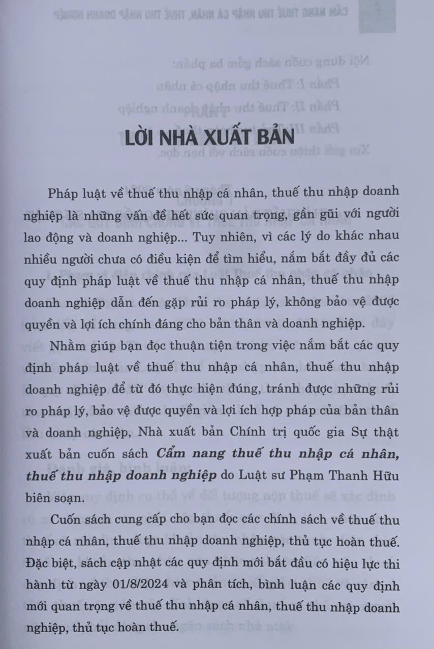 Nhằm giúp bạn đọc thuận tiện trong việc nắm bắt các quy định pháp luật về thuế thu nhập cá nhân, thuế thu nhập doanh nghiệp, từ đó thực hiện đúng, tránh được những rủi ro pháp lý, bảo vệ được quyền và lợi ích hợp pháp của bản thân và doanh nghiệp, NXB Chính trị quốc gia Sự thật xuất bản cuốn sách Cẩm nang thuế thu nhập cá nhân, thuế thu nhập doanh nghiệp do Luật sư Phạm Thanh Hữu biên soạn.