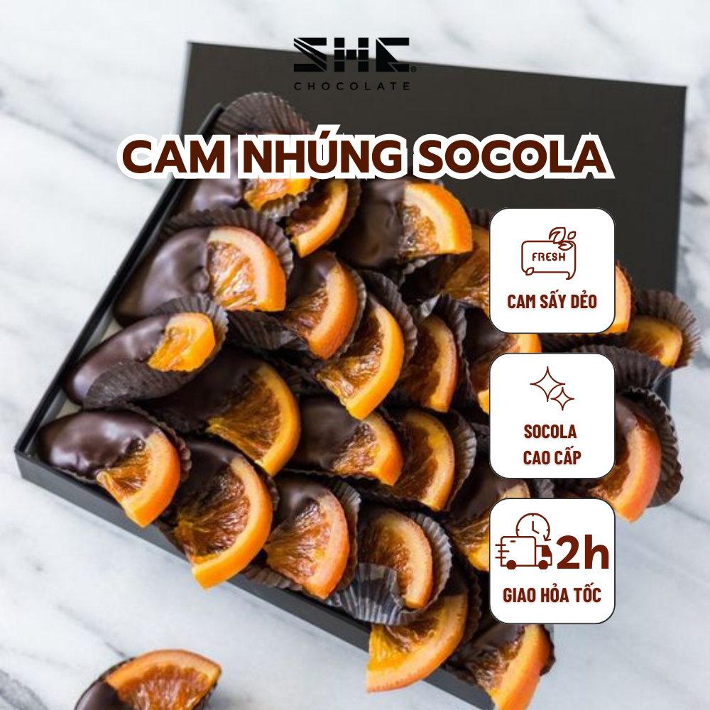 Mua tại TiktokCam sấy dẻo nhúng socola SHE Chocolate Socola SHE được làm từ những quả cacao không phân bón và không thuốc bảo vệ thực vật, được chọn lọc rất kỹ từ những nông trại hàng đầu từ các vùng đất của Tây Nguyên, Đông Nam Bộ, đồng bằng sông Cửu Long. Đây chính là những vườn cây cacao ngon nhất thế giới ở Việt Nam. Sự kết hợp đặc biệt giữa trái cây sấy dẻo và socola tạo nên hương vị ấn tượng, khác biệt, độc đáo chỉ có độc nhất tại SHE Socola ngọt ngào tan chảy trên vòm miệng, nó mềm và tròn với vị trái cây êm dịu.