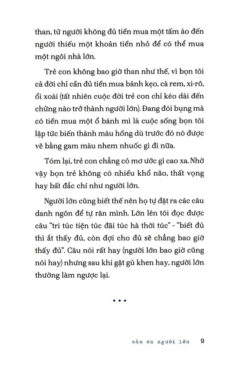 So với trẻ con, người lớn luôn cảm thấy thiếu thốn và luôn cảm thấy đau khổ. “Ôi, đời tôi sao khổ thế này!” - đó là câu người lớn hay than, từ người không đủ tiền mua một tấm áo đến người thiếu một khoản tiền nhỏ để có thể mua một ngôi nhà lớn. Trẻ con không bao giờ than như thế, vì bọn tôi cả đời chỉ cần đủ tiền mua bánh kẹo, cà rem, xi-rô, ổi xoài (tất nhiên cuộc đời trẻ con chỉ kéo dài đến chừng nào trở thành người lớn). Đang đói bụng mà có tiền mua một ổ bánh mì là cuộc sống bọn tôi lập tức biến thành màu hồng dù trước đó nó được vẽ bằng gam màu nhem nhuốc gì đi nữa.