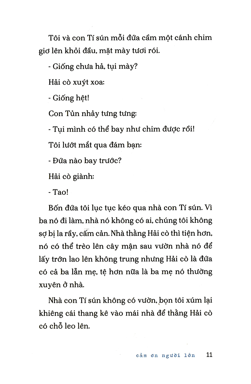 Và cả khi họ đã trưởng thành, bạo chúa thời gian đã vùng vẫy thế nào trong cuộc đời của những nhân vật mà bạn yêu quý…Hãy bắt đầu đọc từ bất cứ trang nào, có thể đọc bất cứ lúc nào, và cùng với bất cứ ai. Bạn sẽ nhận được món quà “n trong 1” của nhà văn Nguyễn Nhật Ánh: sẽ n lần thổn thức qua 1 cuốn sách 19 chương đầy ắp tình bạn ngây thơ, tình xóm giềng tốt lành nhân ái, tình yêu đắm đuối ngọt ngào… Cảm ơn người lớn được Nguyễn Nhật Ánh đặt bút viết đúng sau 10 năm ra đời Cho tôi xin một vé đi tuổi thơ – cuốn sách bán chạy tới nay đã 400.000 bản.