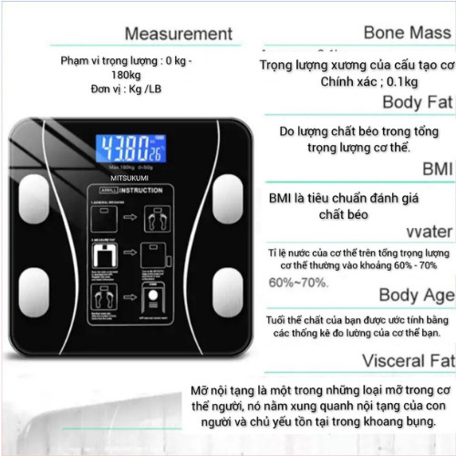 - Chất liệu: Kính chịu lực - Kích thước màn hình: 60mm - Bộ nhớ:8 người - Màn hình hiển thị: LCD - Chức nắng: tính thành phần cơ thể - Trọng lượng sản phẩm: