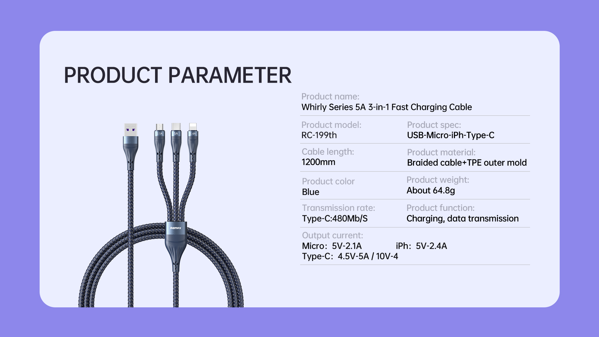 Cáp sạc 3 đầu đa năng thương hiệu Remax -Model: RC199th -Sản xuất tại: Trung Quốc Mô tả: -Giao diện: USB to C+ip+Micro -Dòng sạc : ● Type-C: 4.5V-5A 10V-4A ● iP: 5V-2.4A ● Micro: