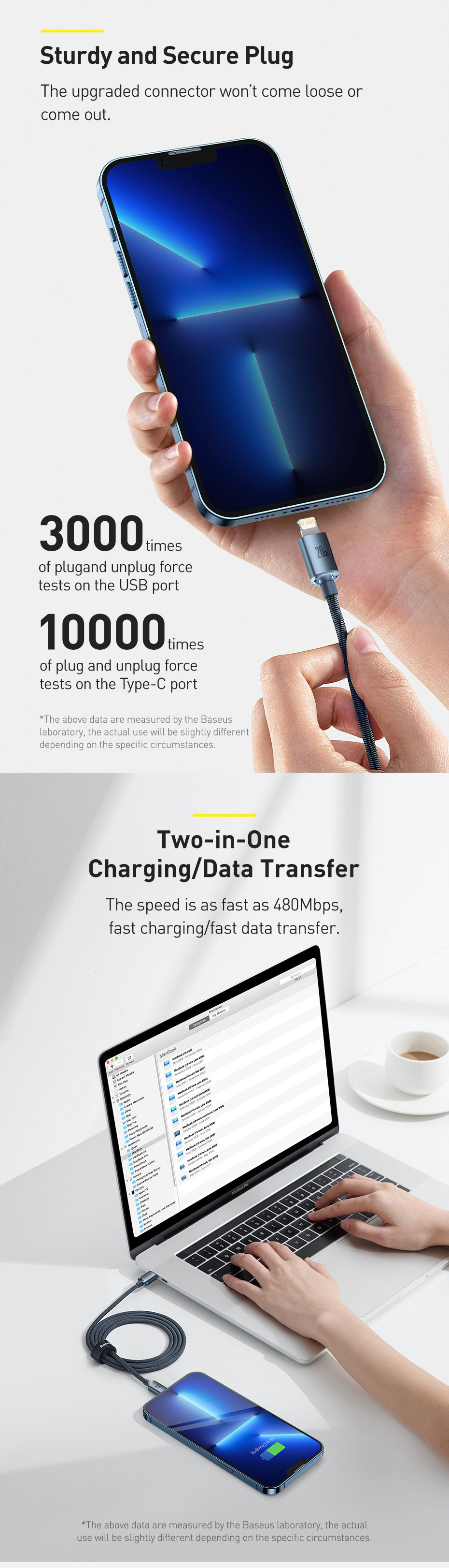 - Hỗ trợ công suất đến 20W đối với cáp USB-C to Lai-nin cho tốc độ sạc nhanh hơn 40% so với các loại cáp thông thường.