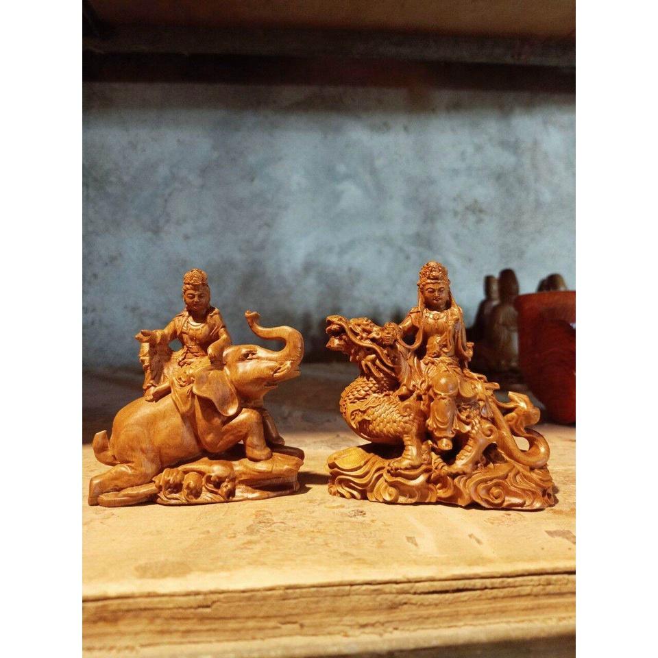 Cặp tượng phật văn thù và phổ hiền cưỡi linh thú cao 15cm gỗ bách xanh