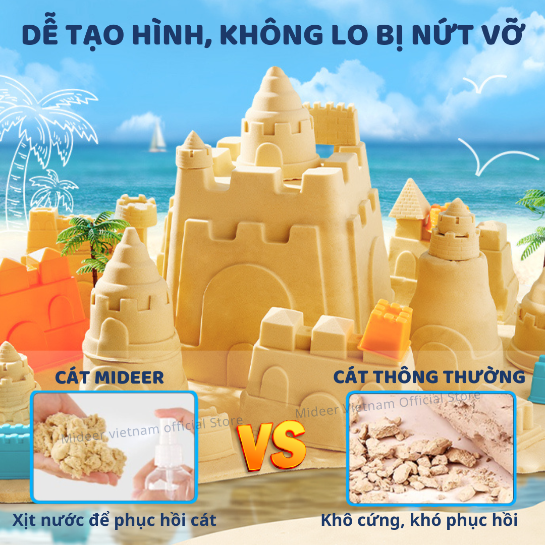 - AN TOÀN VÀ ĐA NĂNG: Cát động lực cho bé Mideer an toàn là loại cát được chọn lọc kỹ lưỡng, cho con yêu trải nghiệm chơi cát tốt nhất… như chơi ở biển Maldives! *So sánh cát động lực Mideer với các loại cát khác: +Cát Động Lực Mideer: Mịn, không dính, không mùi, bền lâu và an toàn. +Cát màu thông thường: Dễ phai màu, dễ vỡ, dính và có thể gây dị ứng. +Cát thật: Thô ráp, dễ sụp đổ, dính và có thể chứa vi khuẩn.