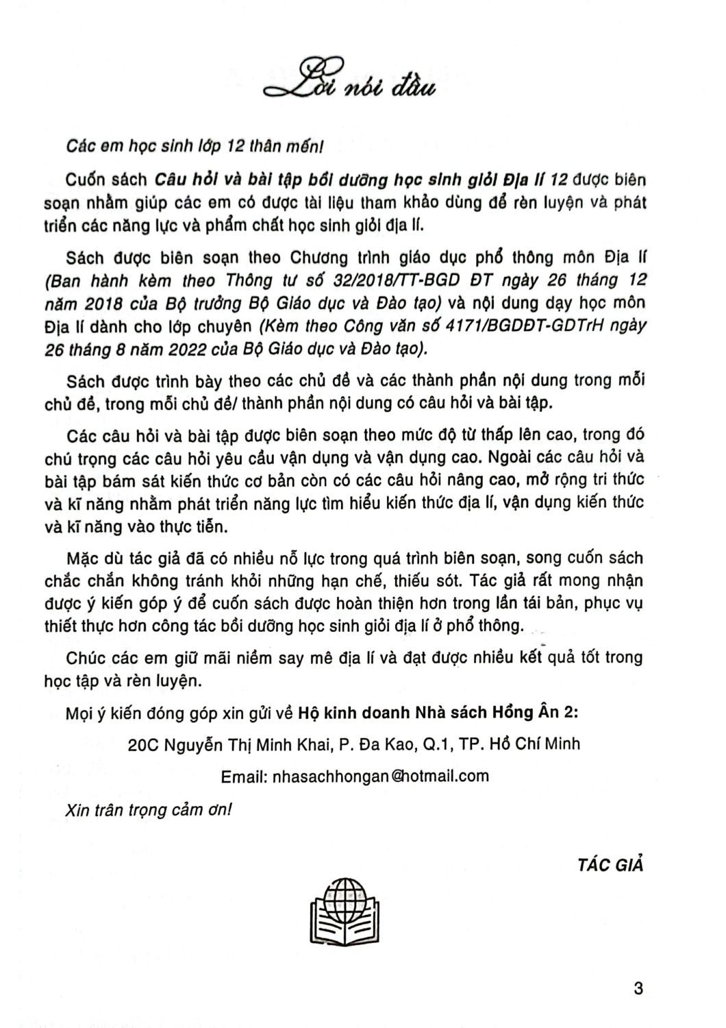 Câu Hỏi Và Bài Tập Bồi Dưỡng Học Sinh Giỏi Địa Lí 12 GIỚI THIỆU SÁCH: Cuốn sách Câu Hỏi Và Bài Tập Bồi Dưỡng Học Sinh Giỏi Địa Lí 12 được biên soạn nhằm cung cấp cho các học sinh nguồn tài liệu tham khảo chất lượng, giúp họ rèn luyện và phát triển các năng lực và phẩm chất cần thiết cho môn Địa lí. Sách được biên soạn theo Chương trình giáo dục phổ thông môn Địa lí (Ban hành kèm theo Thông tư số 32/2018/TT-BGD ĐT ngày 26 tháng 12 năm 2018 của Bộ trưởng Bộ Giáo dục và Đào tạo) và nội dung dạy học môn Địa lí dành cho lớp chuyên (Kèm theo Công văn số 4171/BGDĐT-GDTrH ngày 26 tháng 8 năm 2022 của Bộ Giáo dục và Đào tạo). Mỗi chủ đề trong sách được trình bày một cách có cấu trúc, từ các khái niệm cơ bản đến những vấn đề phức tạp hơn, đi kèm với câu hỏi và bài tập phong phú. Những câu hỏi được thiết kế theo mức độ khó dần, từ những câu hỏi yêu cầu hiểu biết cơ bản đến những câu hỏi đòi hỏi vận dụng sâu sắc và mở rộng kiến thức. Đặc biệt, sách còn tập trung vào việc phát triển năng lực tìm hiểu và áp dụng kiến thức địa lí vào thực tiễn, giúp học sinh có thể tiếp cận và giải quyết các vấn đề địa lí phức tạp một cách chủ động và sáng tạo. Mặc dù tác giả đã có nhiều nỗ lực trong quá trình biên soạn, song cuốn sách chắc chắn không tránh khỏi những hạn chế, thiếu sót. Tác giả rất mong nhận được ý kiến góp ý để cuốn sách được hoàn thiện hơn trong lần tái bản, phục vụ thiết thực hơn công tác bồi dưỡng học sinh giỏi địa lí ở phổ thông.
