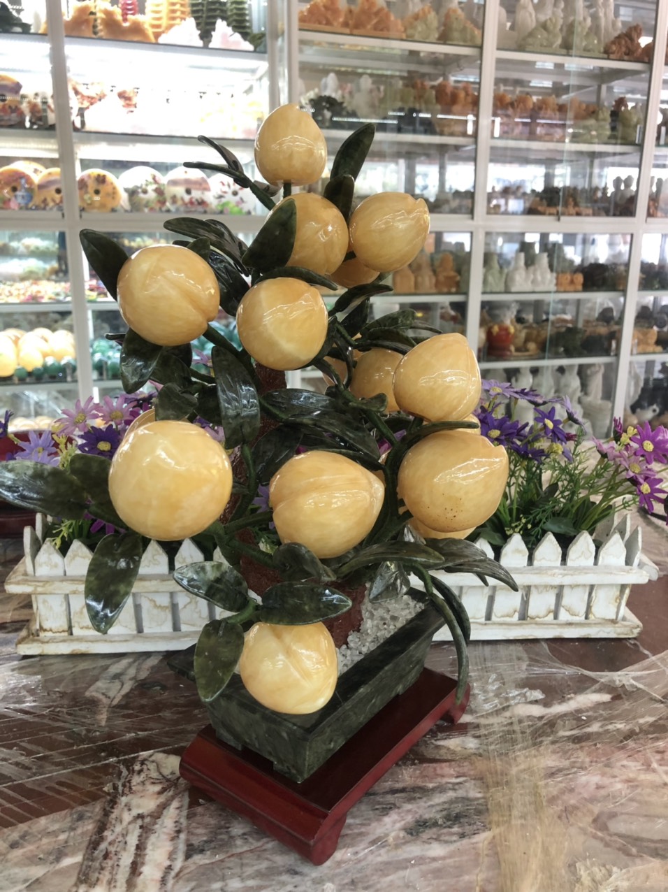 Tượng Cây Đào mới vàng 13 quả canxit vàng tự nhiên cao 40cm x ngang 34cm x sâu 20cm tài lộc hợp ACE mệnh kim thổ Trưng bày phòng khách rất là sang Cây đào
