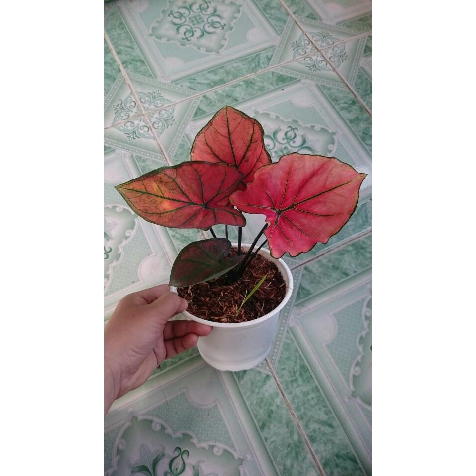 Điểm nổi bật nhất ở cây môn này là hình dáng lá độc đáo. Với những chiếc lá hình tim, nổi bật lên bề mặt lá là những đường gân và lá có màu đỏ rực rỡ, độc đáo.
