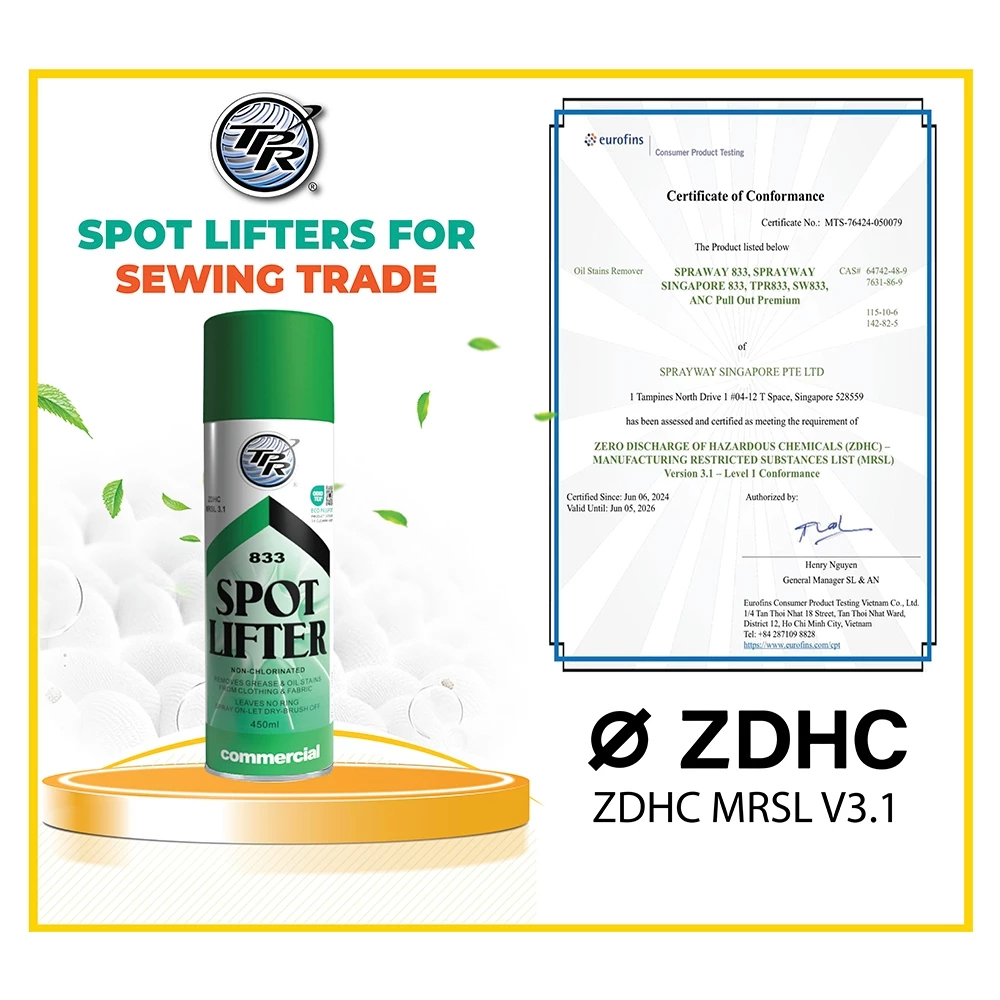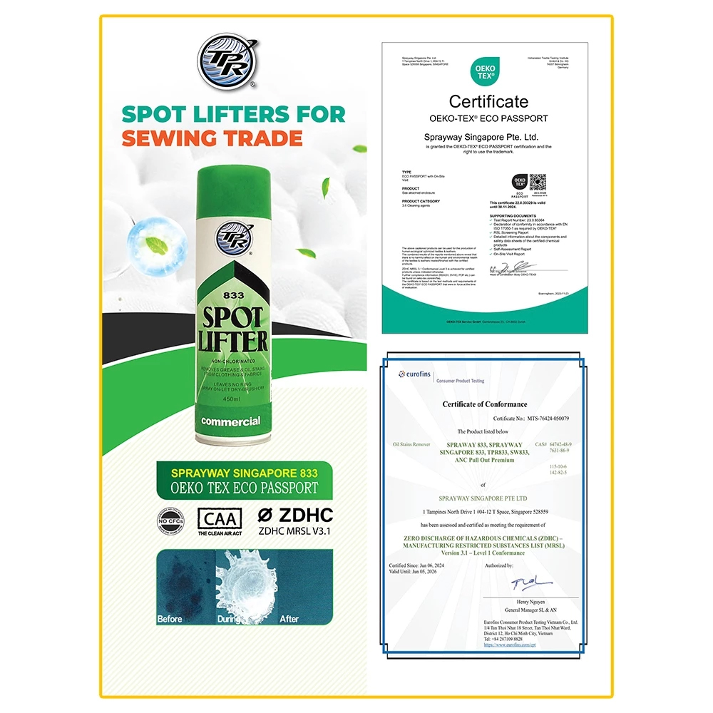 Chất tẩy không chứa chất Chlorinated, đạt tiêu chuẩn về an toàn môi trường. Đặc biệt, tất cả các sản phẩm Spot-lifter 833 của chúng tôi đều đạt chứng nhận OEKOTEX 3.6 & ZDHC 3.1