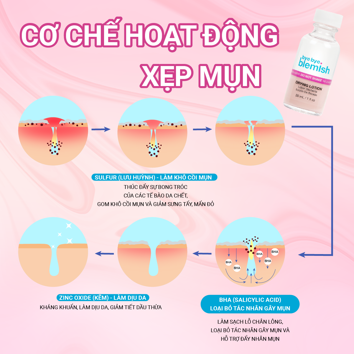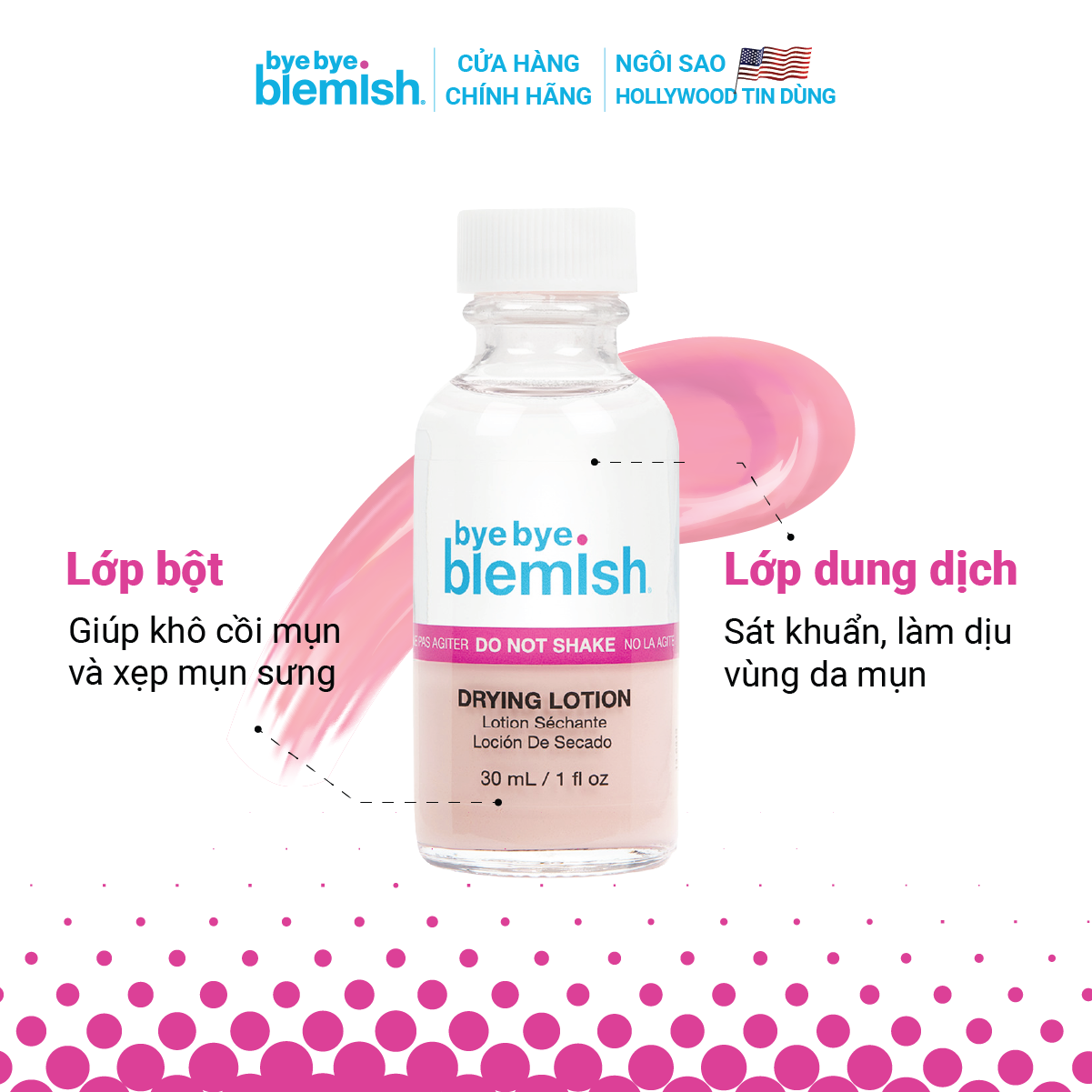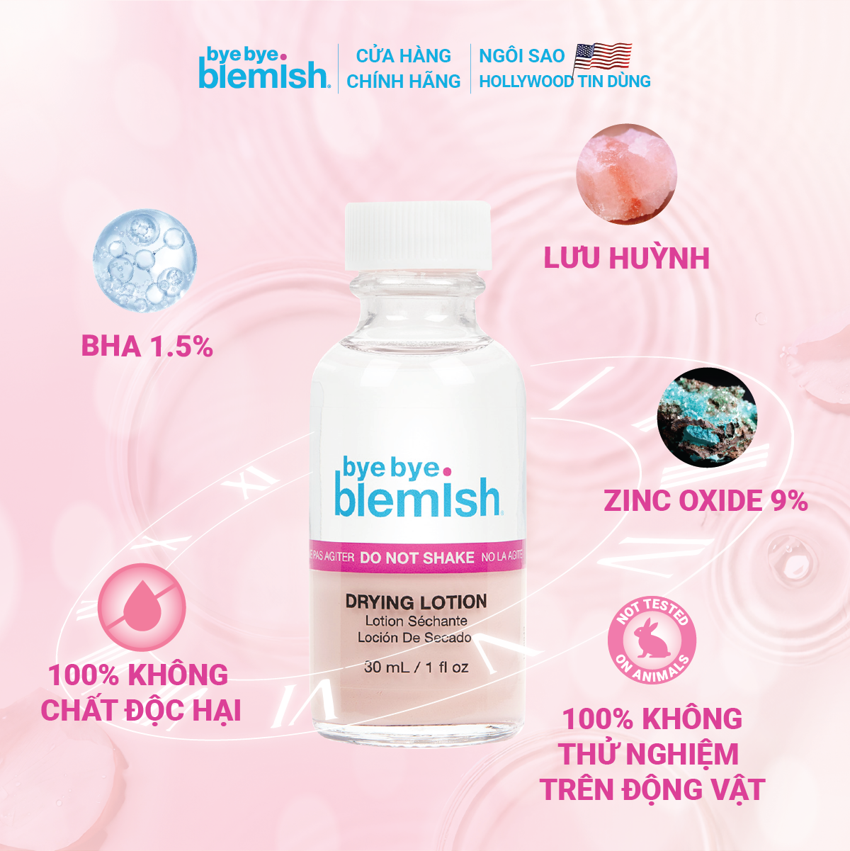 - Không chất độc hại, không thử nghiệm trên động vật. LƯU Ý: - Kết quả thực tế nhanh hay chậm có thể phụ thuộc vào mức độ của nốt mụn và quá trình chăm sóc da hằng ngày. - Sản phẩm này không phải là thuốc và không có chức năng thay thế thuốc chữa bệnh. HƯỚNG DẪN SỬ DỤNG Bước 1: Không lắc sản phẩm. Để dung dịch tách thành 2 lớp rõ ràng. Bước 2: Vệ sinh sạch da bằng sữa rửa mặt. Bước 3: Nhúng tăm bông vào lớp bột màu hồng. Bước 4: Chấm mụn trực tiếp lên các nốt mụn, không chấm lan ra xung quanh. Bước 5: Để qua đêm. Lưu ý: Sử dụng ở bước cuối cùng trong quy trình skincare. THÀNH PHẦN Salicylic Acid 1,5%, Zinc oxide 9%, Water (Aqua), Camphor, Magnesium Aluminum Silicate, Iron Oxides (C177491), Sulfur, Isopropyl Alcohol. THÔNG TIN THƯƠNG HIỆU - Bye Bye Blemish là thương hiệu mỹ phẩm đến từ Mỹ, thuộc công ty American International Industries.