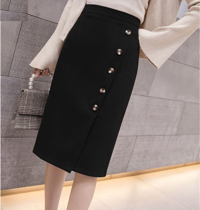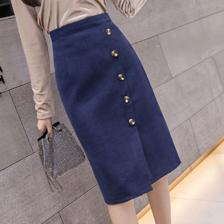Thiết kế chân váy bút chì phối nút trên nền vải tuyết mưa mịn đẹp, dễ mặc đi làm, dự tiệc Màu sắc: xanh, đen Size: S M L XL Chất liệu: tuyết mưa