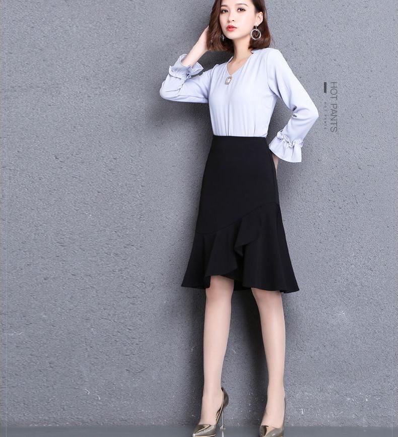 Thiết kế váy đuôi cá tà xéo sang trọng trên nền vải tuyết mưa mịn đẹp tạo cảm giác thoải mái, thích hợp mặc công sở, cafe cùng bạn bè, người thân. Màu sắc: đen Size: S-M-L-XL Chất liệu: tuyết mưa