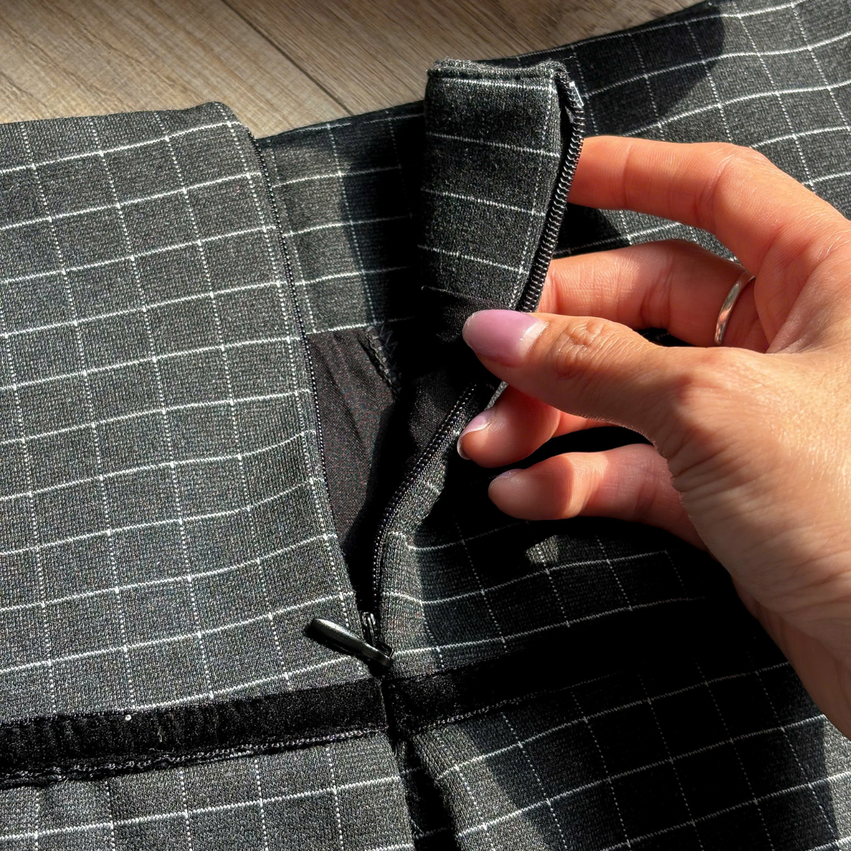 CHẤT LIỆU KAKI THUN CO GIẢN, MỀM ĐỨNG PHOM CHÂN VÁY HOẠ TIẾT CARO PHOM CHỮ A NGẮN, TÚI 2 BÊN SƯỜN PHÍA TRƯỚC THIẾT KẾ PHẦN VẠT ĐẮP LÊN TRÊN PHÍA SAU XẾP LY