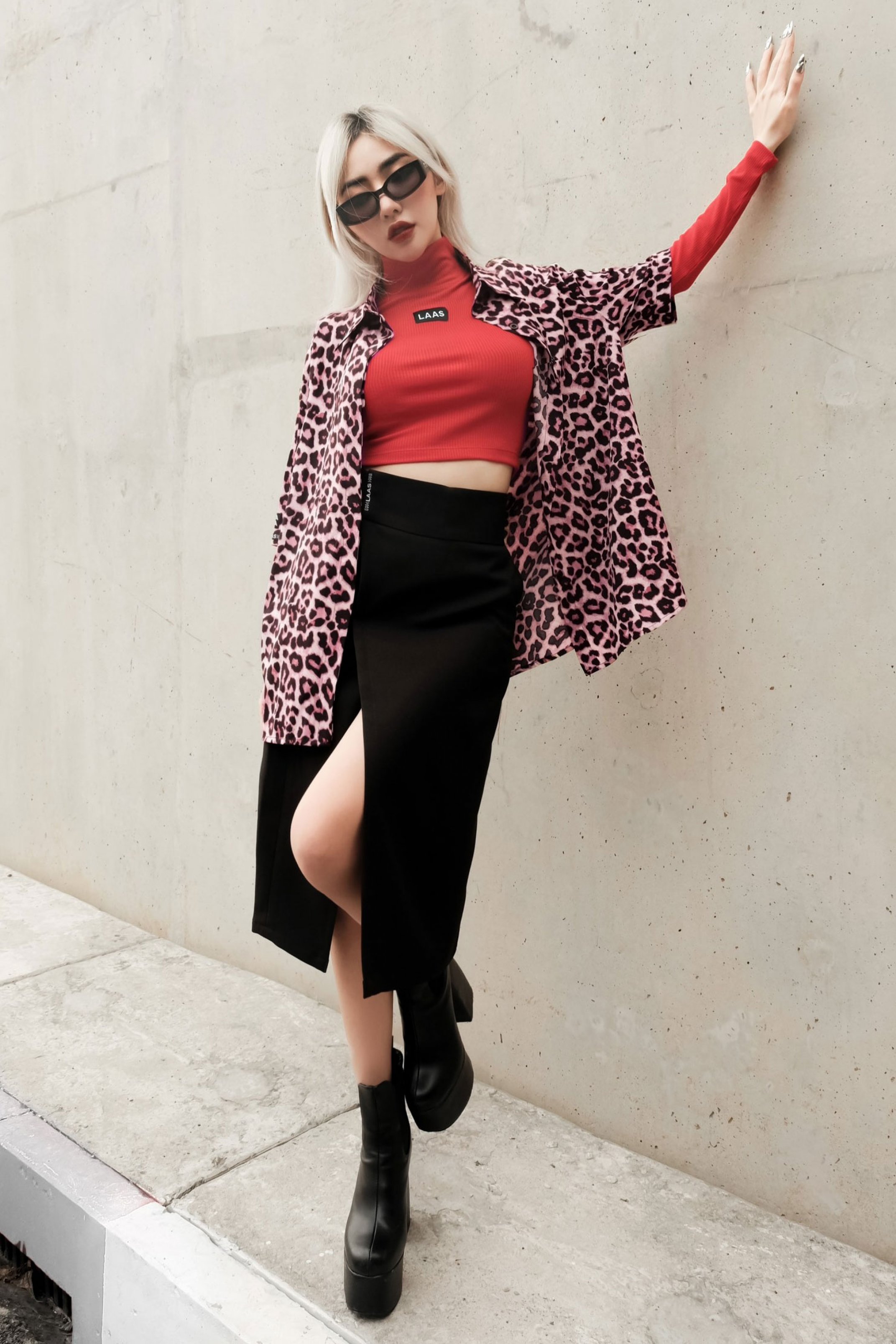 CHẤT LIỆU TUYTSY XƯƠNG CÁ CHÂN VÁY MÀU ĐEN PHOM CHỮ A DÀI QUA GỐI THIẾT KẾ VẠT ĐẮP XÉO, KHI BƯỚC ĐI XẺ 1 BÊN CHÂN GỢI CẢM TAG LOGO ĐƯỢC GẮN Ở PHẦN BẢNG LƯNG TO