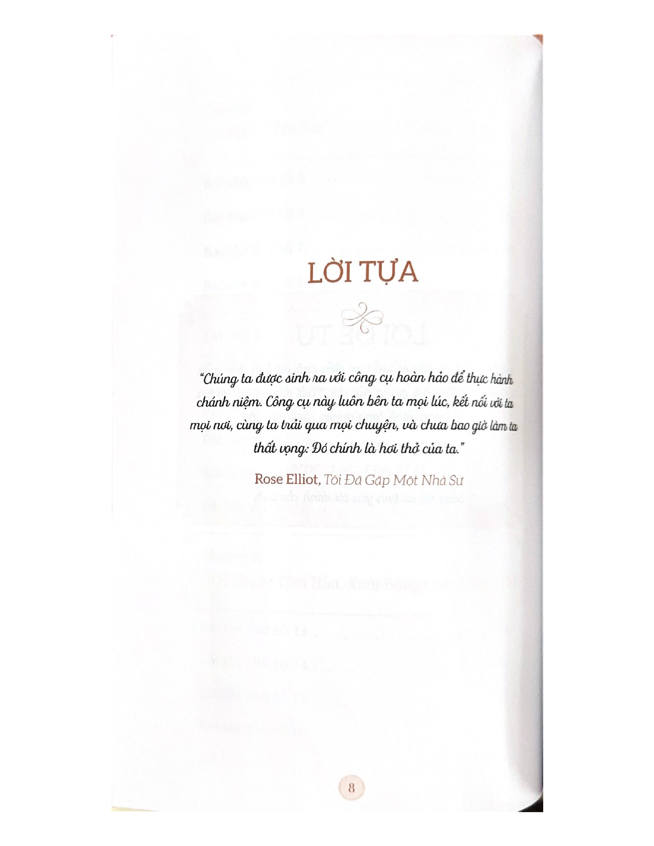 - Giới thiệu Every Breath You Take - Chánh Niệm Trong Từng Hơi Thở Từ khởi sinh, chúng ta đã có sẵn trong người một công cụ tuyệt hảo để thực hành chánh niệm. Công cụ này luôn hiện diện trong ta và quanh ta. Ta có thể kết nối với nó bất cứ lúc nào ta muốn, trong mọi tình huống và nó chẳng bao giờ rời xa ta. Đó chính là hơi thở Chánh niệm và hơi thở luôn song hành cùng nhau, khi bạn đồng thời thực hành chánh niệm và hít thở, thì điều tưởng chừng như vô vị, nhàm chán, máy móc kia liền trở nên sống động. Tựa như xăng bơm vào bình hay như cánh buồm no gió, chánh niệm sẽ trở thành một trải nghiệm thích thú, sảng khoái.