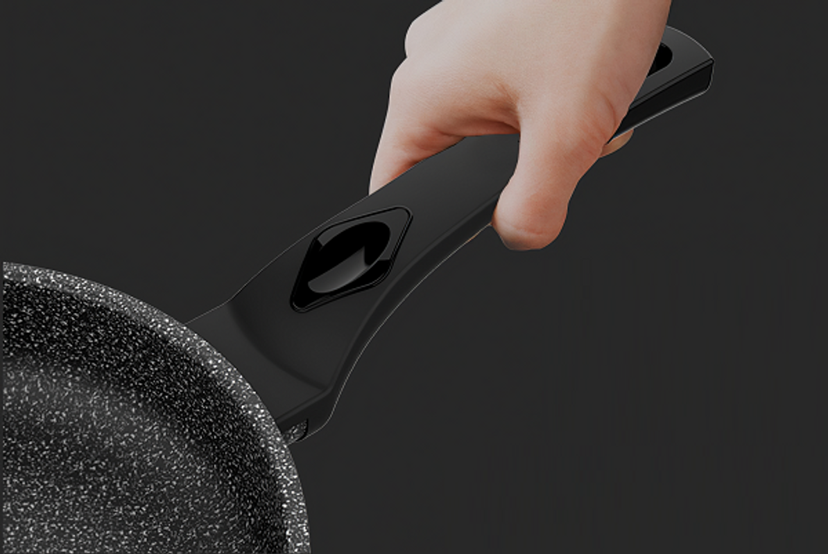 - Tay cầm: Tay cầm được tạo thành bởi nhựa chịu nhiệt, đốt không cháy, không sun. Thiết kế tay cầm thân thiện với người sử dụng. Đuôi cán có lỗ treo chảo.
