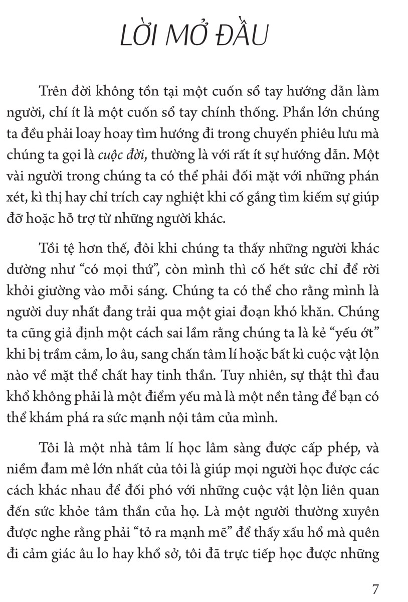 Trên đời không tồn tại một cuốn sổ tay hướng dẫn làm người, chi ít là một cuốn sổ tay chính thống. Phần lớn tất cả chúng ta đều đang loay hoay tìm kiếm con đường để bước đi trong chuyến phiêu lưu vĩ đại mang tên cuộc đời, thường là với rất ít sự hướng dẫn. Chúng ta thường cho rằng mình là người duy nhất gặp khó khăn và giả định một cách sai lầm rằng chúng ta là "kẻ yếu ớt" khi bị trầm cảm, lo âu, sang chấn tâm lí hoặc bất kì sự vật lộn nào về mặt thể chất hay tinh thần.
