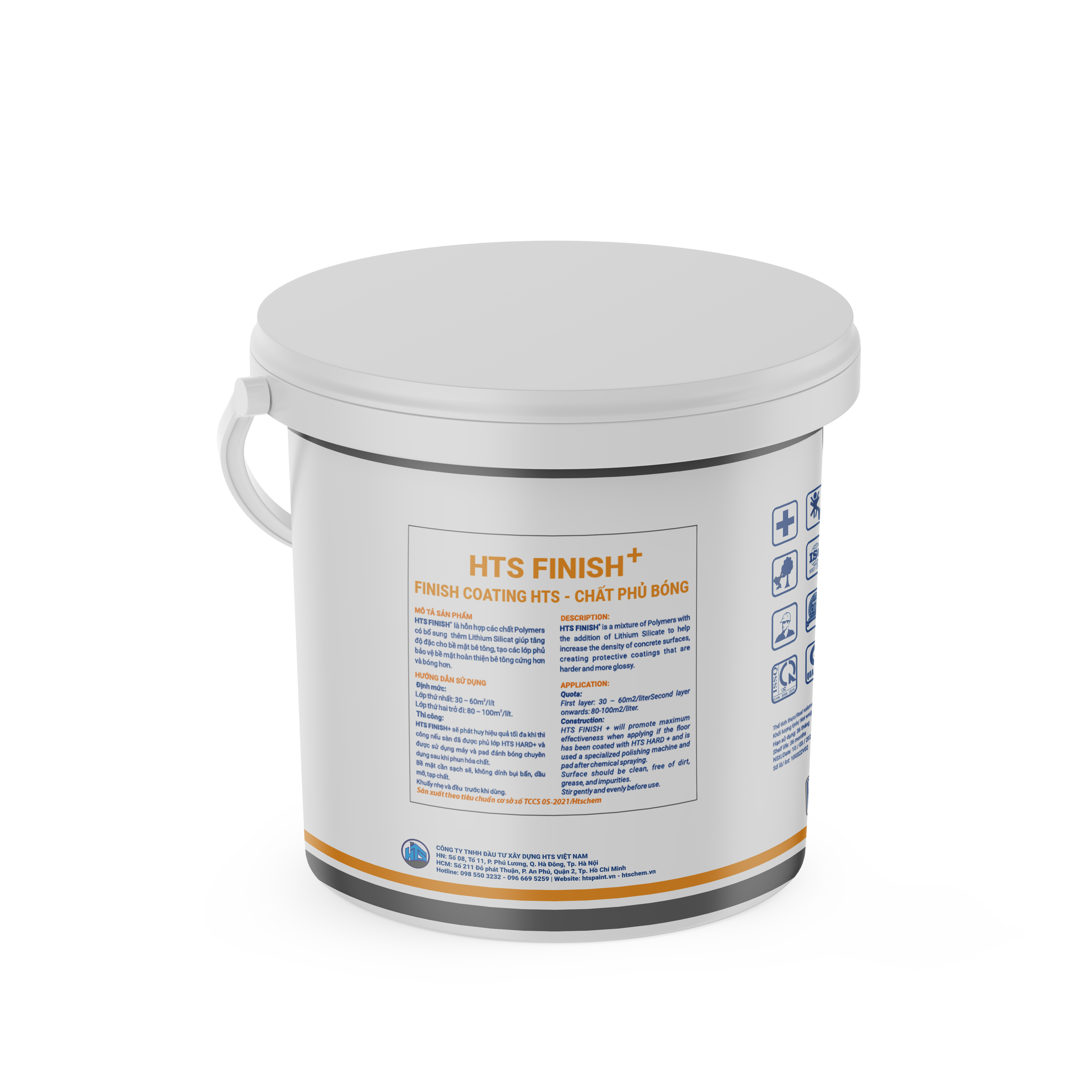 Hoá chất phủ bóng sàn HTS Finish+ là hỗn hợp các chất Polymer có bổ sung thêm Lithium Silicat giúp tăng độ đặc cho bề mặt bê tông, tạo các lớp phủ bảo vệ bề mặt hoàn thiện bê tông cứng hơn và bóng hơn.