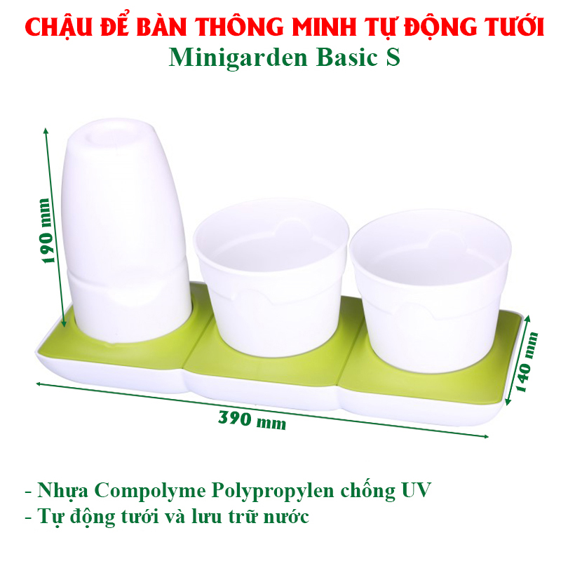 1.Mô Tả Chậu KIT Tự Dưỡng Minigarden Basic: + Nhập khẩu: Bồ Đào Nha + Kích thước Base Chậu: Ngang 38cm x 14 cm x 22 cm. Bảo Hành Chậu Tự Dưỡng Basic lên đến 10