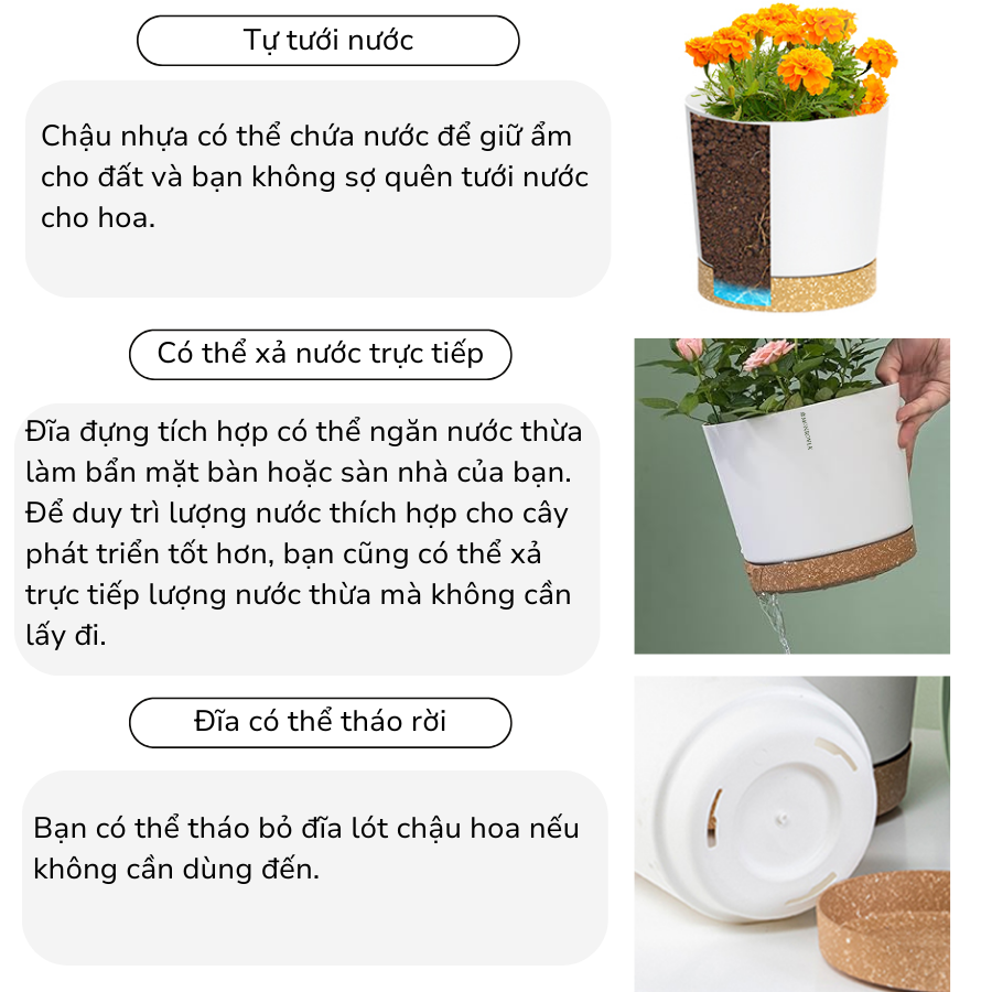 Chậu trồng cây tự tưới nước: Có 3 lỗ thoát nước để tưới nước và đơn giản hóa việc chăm sóc cây, giúp bạn dễ dàng tưới nước cho cây và tránh tắc nghẽn, thiết kế khóa độc đáo cho phép đĩa lót gắn vào chậu để dễ di chuyển và giữ nước. Bạn cũng có thể tháo đĩa lót ra để vệ sinh dễ dàng.