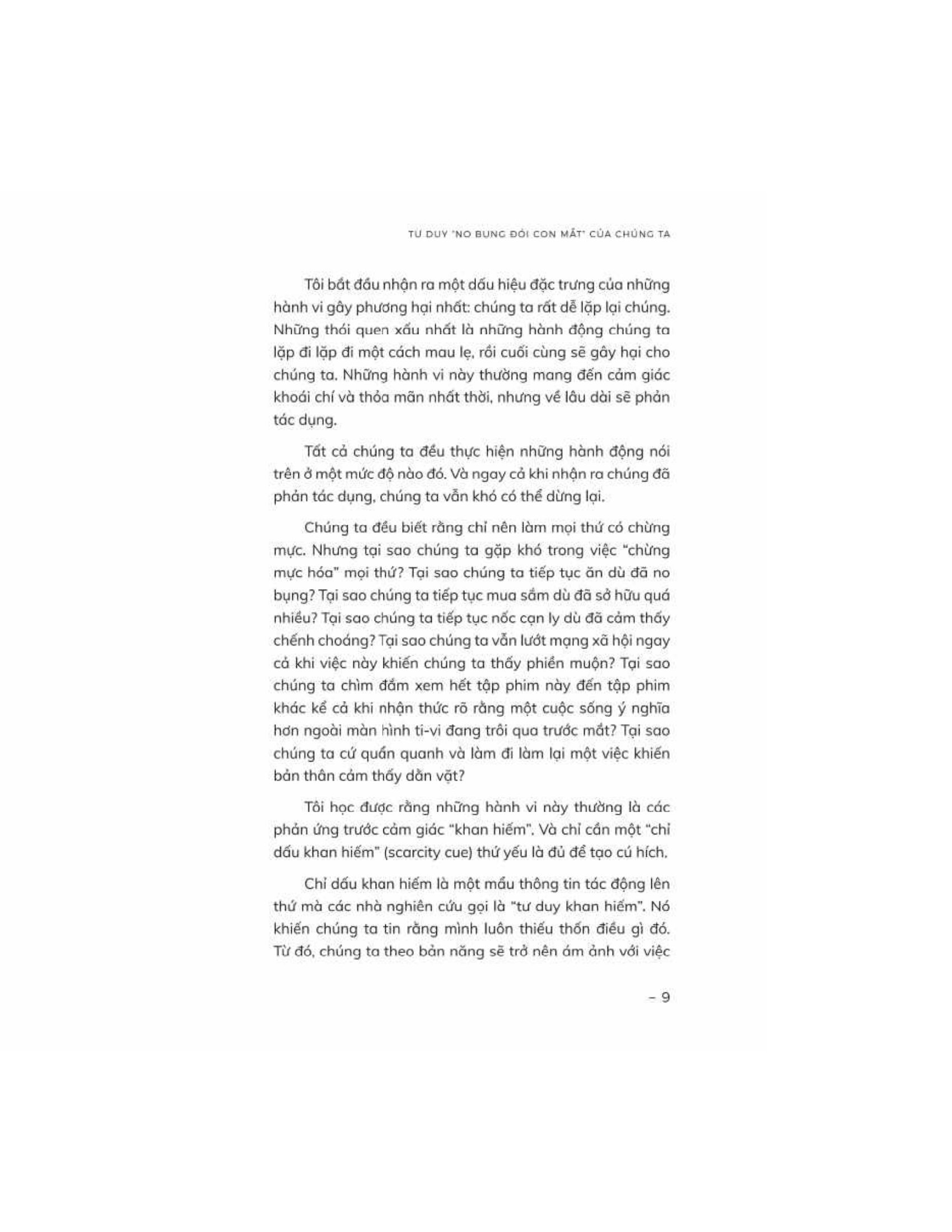 Chế Ngự Tâm Lý “No Bụng Đói Con Mắt” của Michael Easter đưa người đọc vào một hành trình kích thích tư duy để tìm hiểu sự phức tạp của tâm trí con người và lý do đằng sau những ham muốn vô độ của chúng ta. Easter khám phá khái niệm về tư duy khan hiếm, "vòng lặp thiếu thốn" - một chu kỳ liên tục khiến chúng ta mong muốn sở hữu nhiều hơn trong các khía cạnh khác nhau của cuộc sống, từ thực phẩm và của cải vật chất đến thông tin cũng như sức ảnh hưởng.