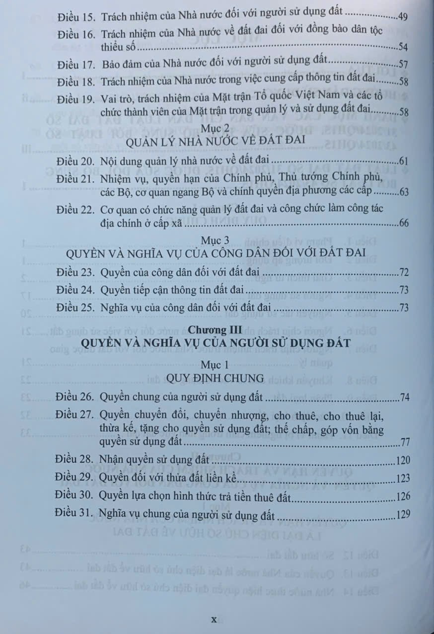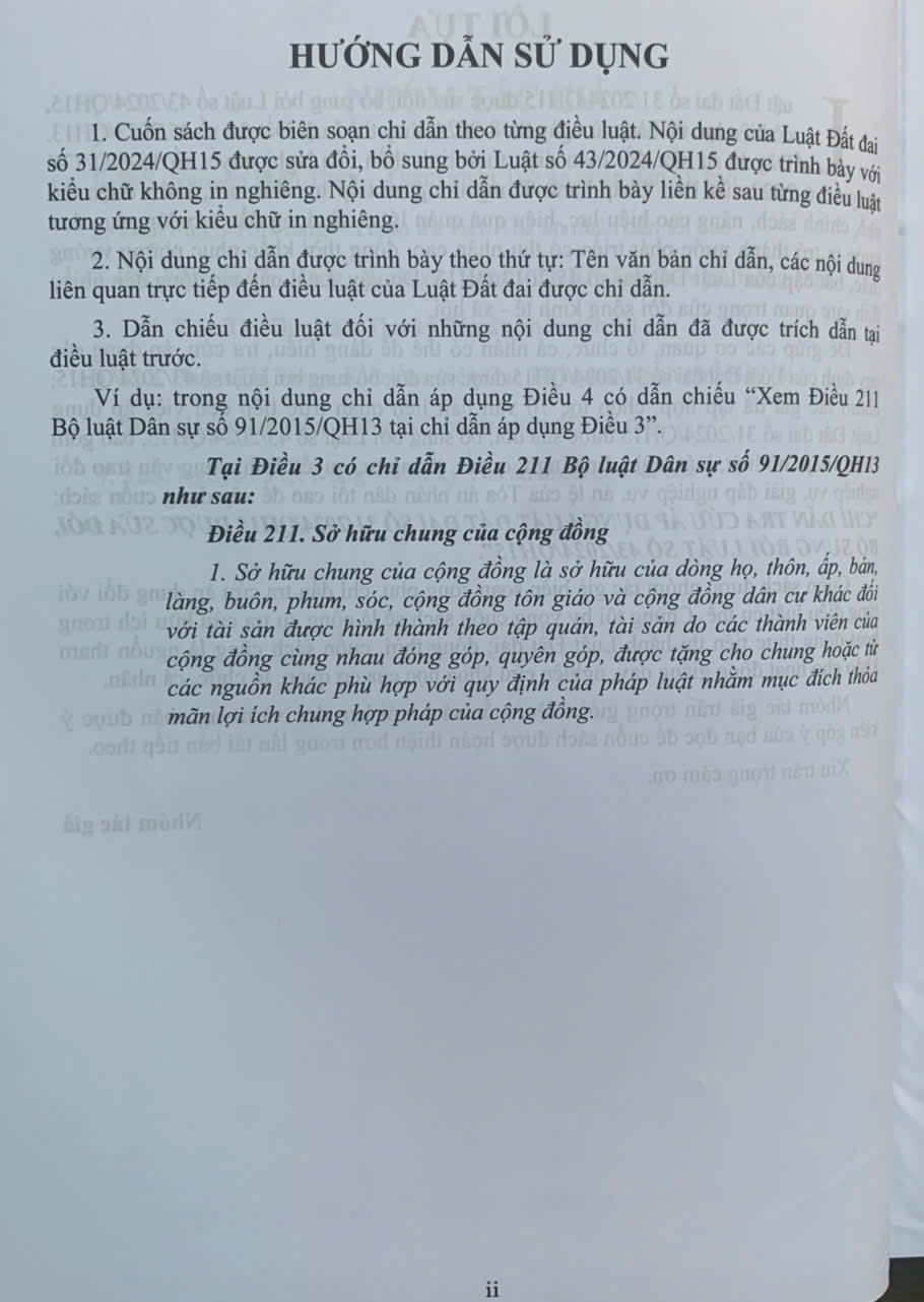 1. Cuốn sách được biên soạn chỉ dẫn theo từng điều luật. Nội dung của Luật Đất đai số 31/2024/QH15 được sửa đổi, bổ sung bởi Luật số 43/2024/QH15 được trình bày với kiểu chữ không in nghiêng. Nội dung chỉ dẫn được trình bày liền kề sau từng điều luật tương ứng với kiểu chữ in nghiêng.