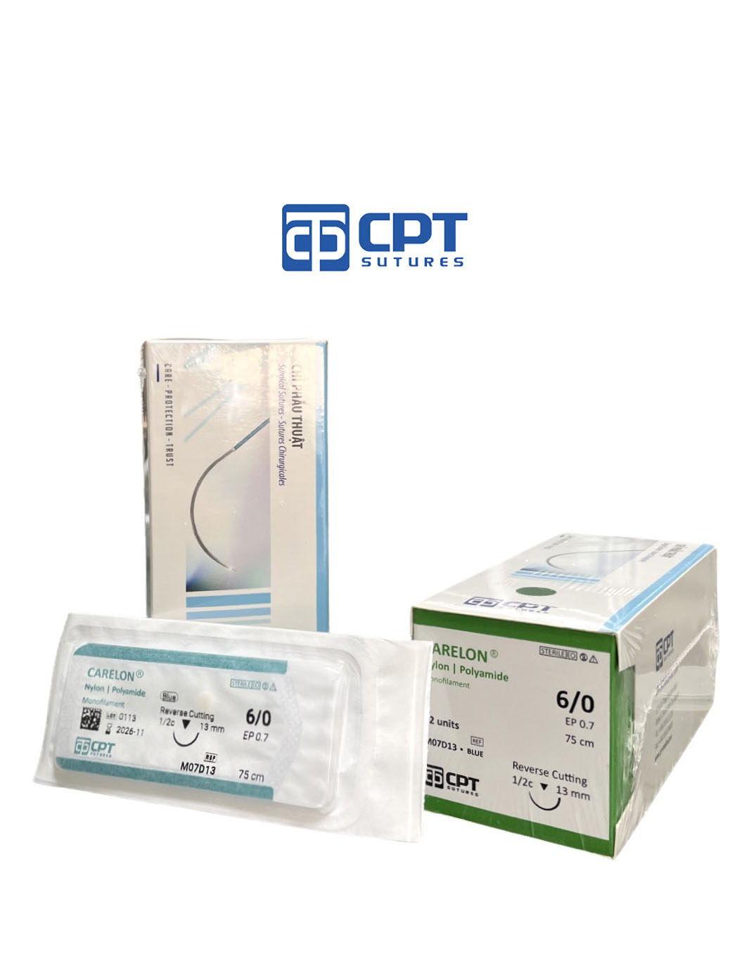 1. Chỉ phẫu thuật không tiêu CPT Carelon Nylon: size cỡ chỉ: 5/0 USP, dài 75 cm, kim tam giác 3/8c, dài 13 mm, mã hàng: M10E13. 2. Chỉ phẫu thuật không tiêu CPT